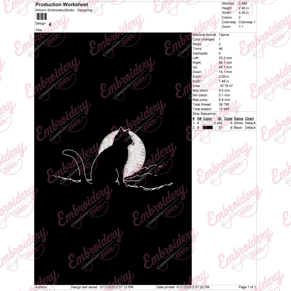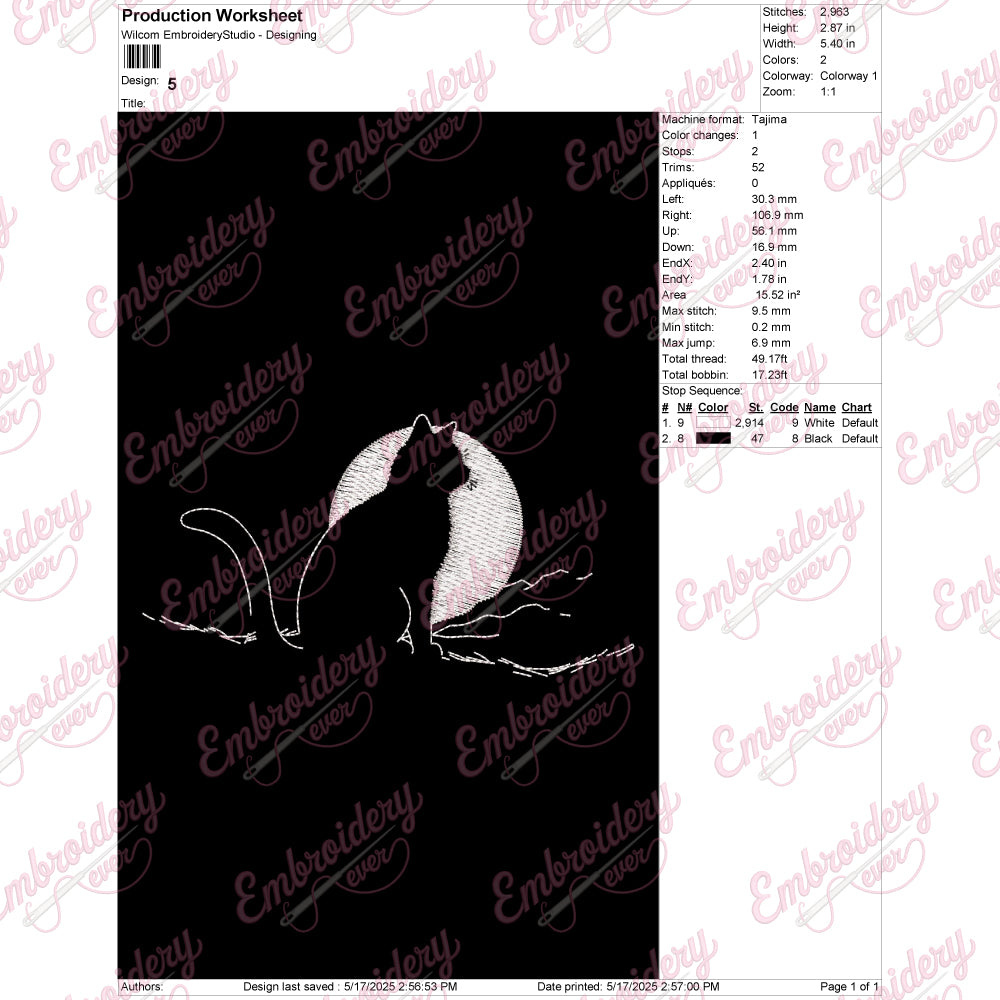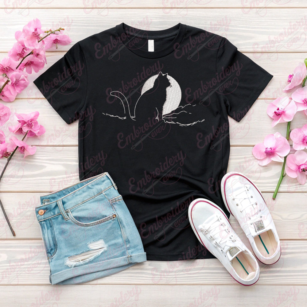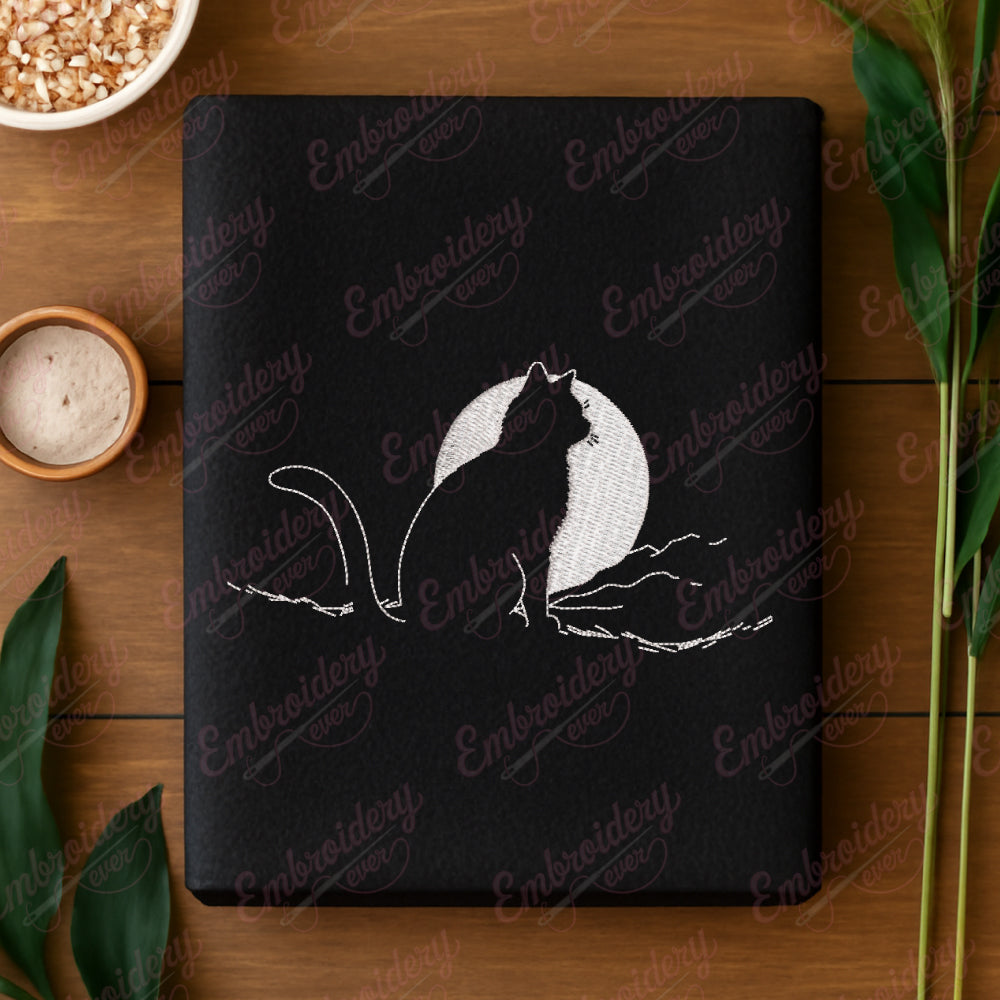 The Cat With Moon Embroidery Design seamlessly blends whimsical charm with artistic precision, offering an intricate pattern perfect for seasoned embroiderers and enthusiasts alike. This design showcases a graceful silhouette of a cat perched beneath a crescent moon, capturing a serene nocturnal scene that evokes mystery and tranquility. Crafted with detailed stitch guidance, it allows for nuanced depths and texture, enhancing the visual appeal on various fabric types. Ideal for customizing garments, home décor, or accessories, this embroidery design provides both an elegant aesthetic and a distinctive touch that elevates any project. Its balanced composition ensures ease of stitching while achieving a sophisticated finished look.