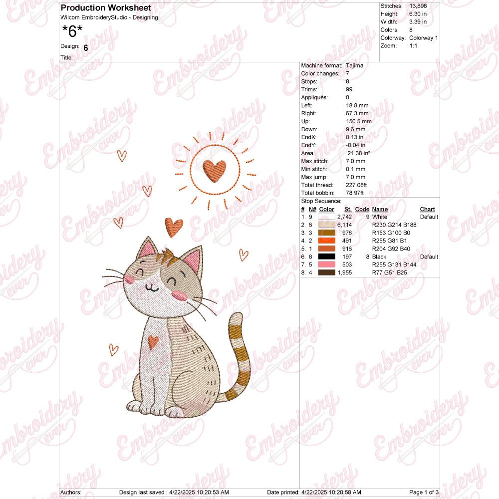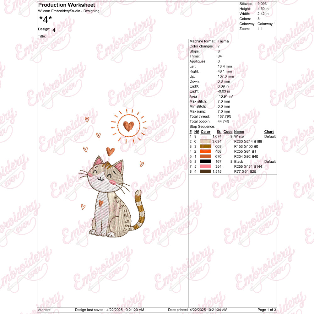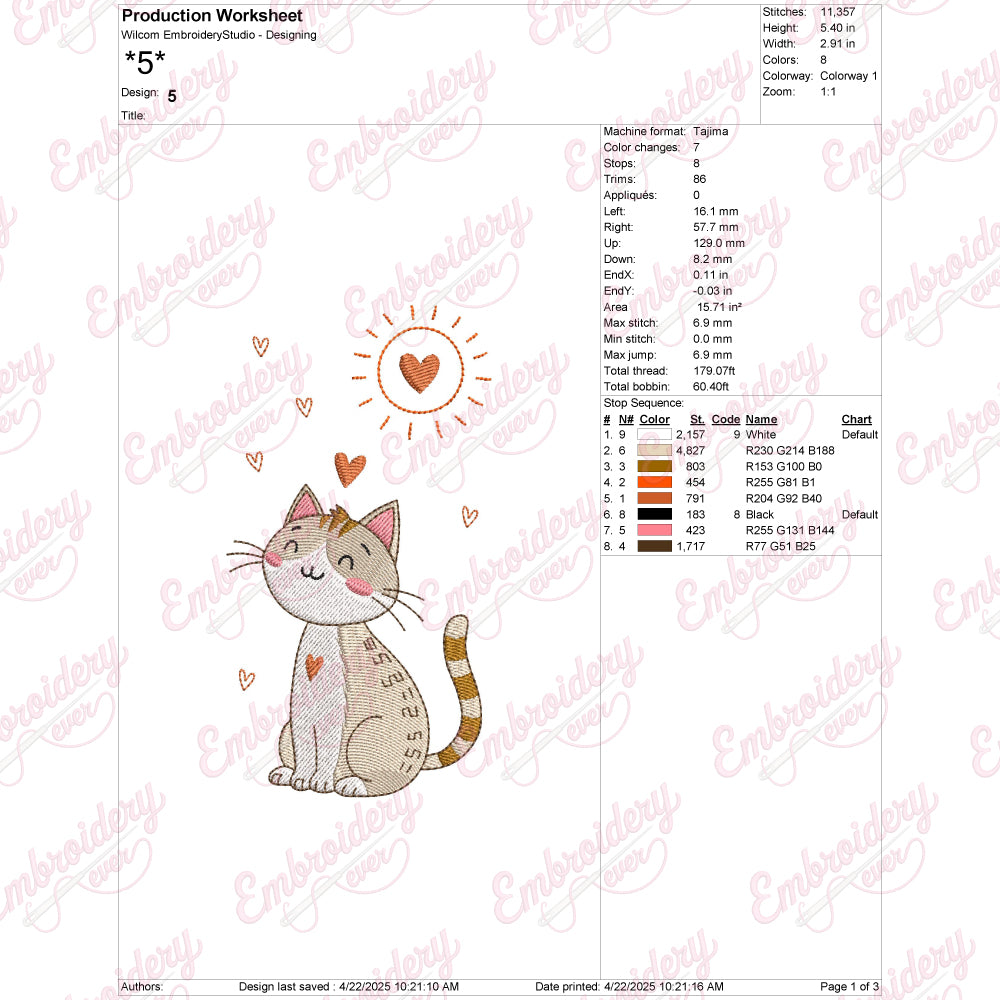 The Colorful Cute Cat Embroidery Design offers a vibrant and detailed pattern perfect for adding a playful touch to any fabric project. Expertly crafted, this design features a charming cat rendered in a spectrum of bright, eye-catching colors that bring the character to life. Ideal for embellishing clothing, accessories, or home décor, it combines intricate stitching with a balanced color palette to ensure both durability and visual appeal. This embroidery design is compatible with a variety of embroidery machines, making it accessible for hobbyists and professionals alike. Its detailed elements allow for precise stitching, resulting in a polished and professional finish every time.