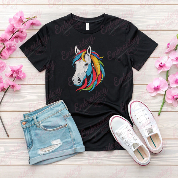 The Colorful Horse Head Embroidery Design showcases a vibrant and detailed depiction of a horse’s head, skillfully crafted to bring dynamic energy and artistic flair to any fabric. This design features a rich palette of...