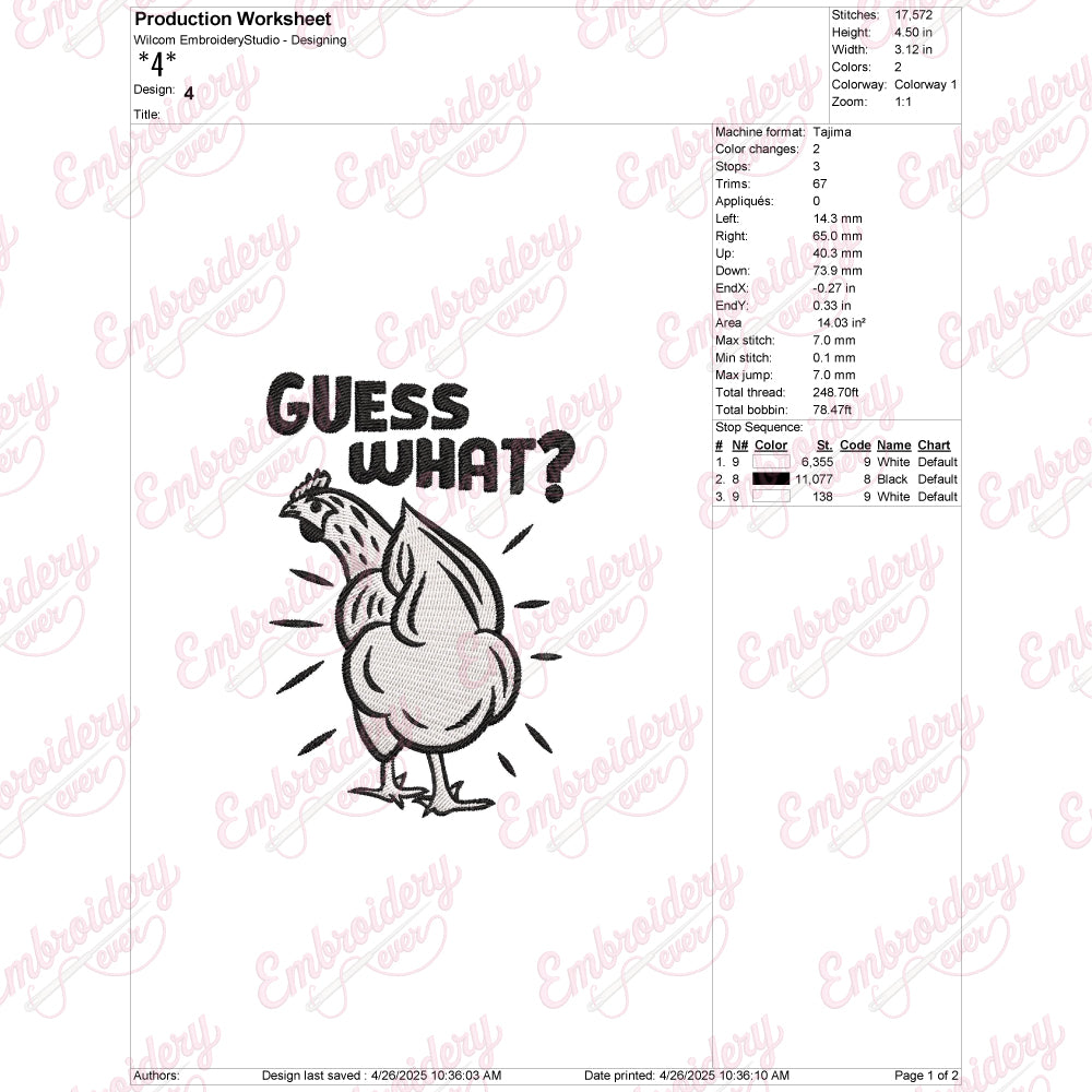 The Guess What Chicken Butt Embroidery Design offers a playful and humorous motif perfect for adding a touch of fun to your embroidery projects. Expertly crafted with clear, bold lines and charming details, this design captures the cheeky phrase in a visually engaging way. Ideal for embellishing casual apparel, accessories, or home textiles, it brings personality and a lighthearted spirit to any fabric. The design’s balanced composition ensures it stitches cleanly and consistently, making it suitable for both beginners and experienced embroiderers. Whether used to create unique gifts or personal items, this embroidery design adds a witty and memorable flair to your creations.