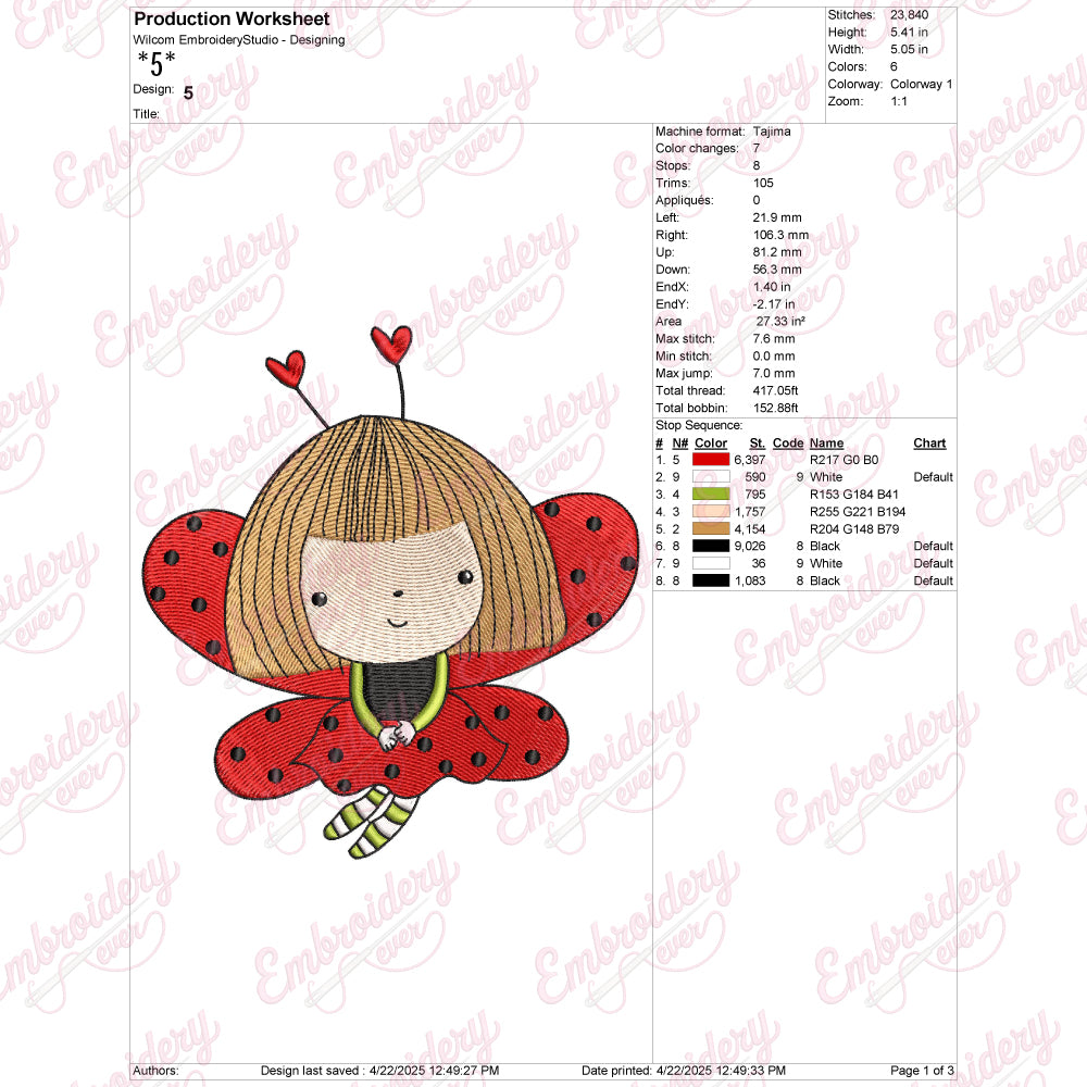 The Ladybug Girl Embroidery Design captures the charming essence of a playful young girl adorned with a vibrant ladybug motif. Expertly crafted with intricate stitch details, this design offers a delightful blend of whimsy and precision, making it ideal for enhancing children’s apparel, accessories, or nursery decor. The carefully balanced color palette ensures vividness and durability, while the fine embroidery technique guarantees a smooth finish that resists wear and tear. Perfect for both personal projects and professional use, this design adds a touch of innocence and joy, elevating any fabric with its detailed artistry and timeless appeal.
