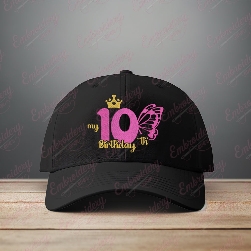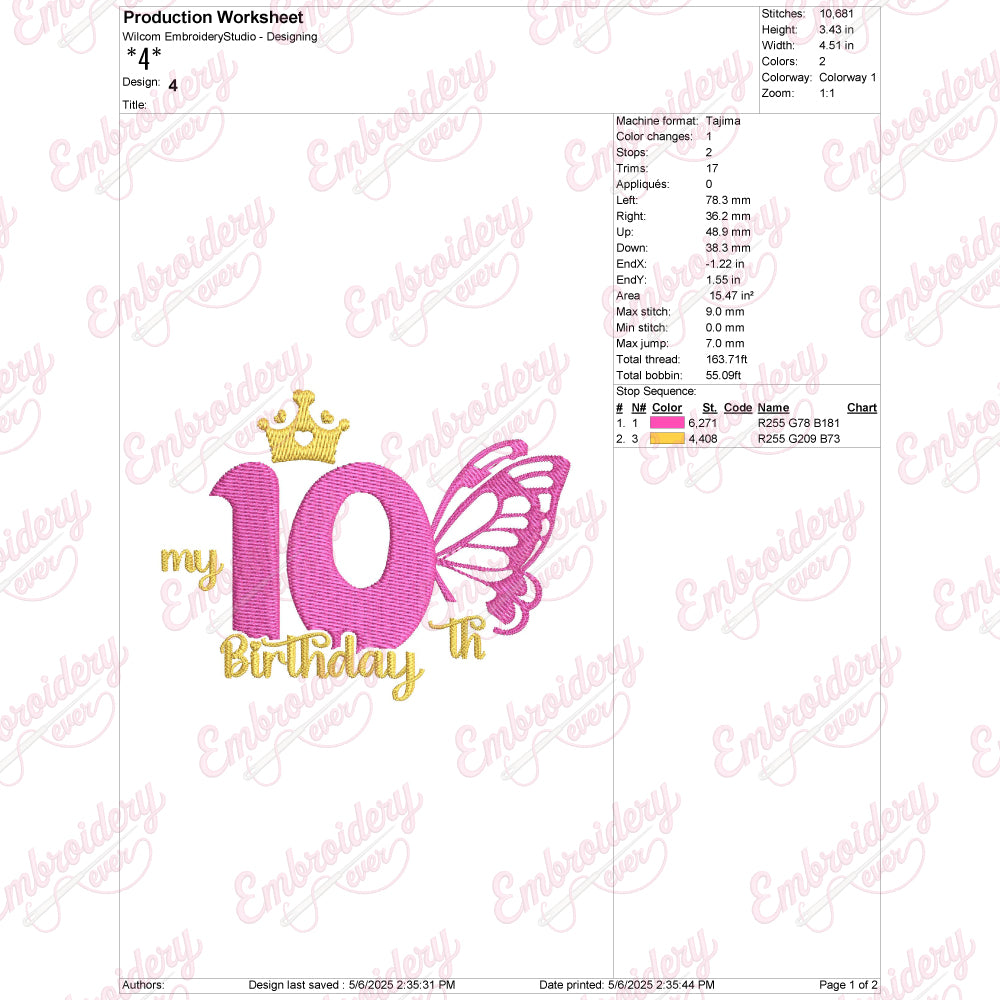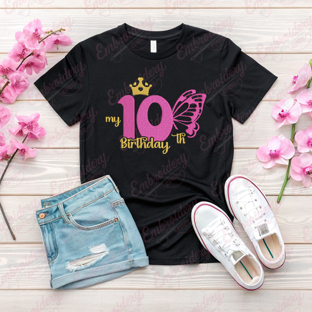 The Butterfly My 10th Birthday Machine Embroidery Design measures 3.43 inches by 4.51 inches (48.9 mm by 38.3 mm), making it an ideal size for personalized birthday projects. This compact yet detailed embroidery design is perfect for commemorating a special milestone with precision and charm. Crafted for machine embroidery enthusiasts, it offers clear stitch definition and smooth edges to ensure professional results on various fabric types. Its moderate dimensions allow for versatile placement on garments, accessories, or keepsakes, enhancing any birthday celebration with a unique and elegant touch. This design combines vibrant motifs with perfect sizing for easy integration into your creative work.