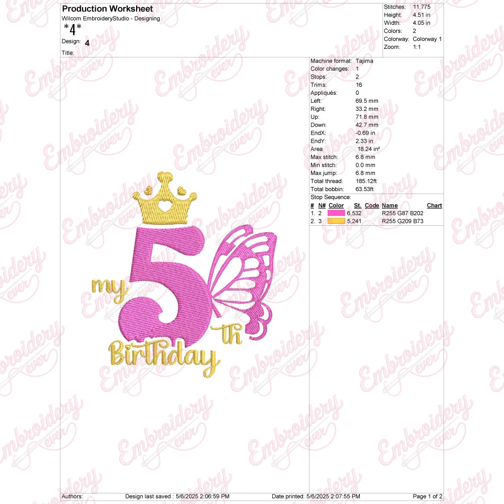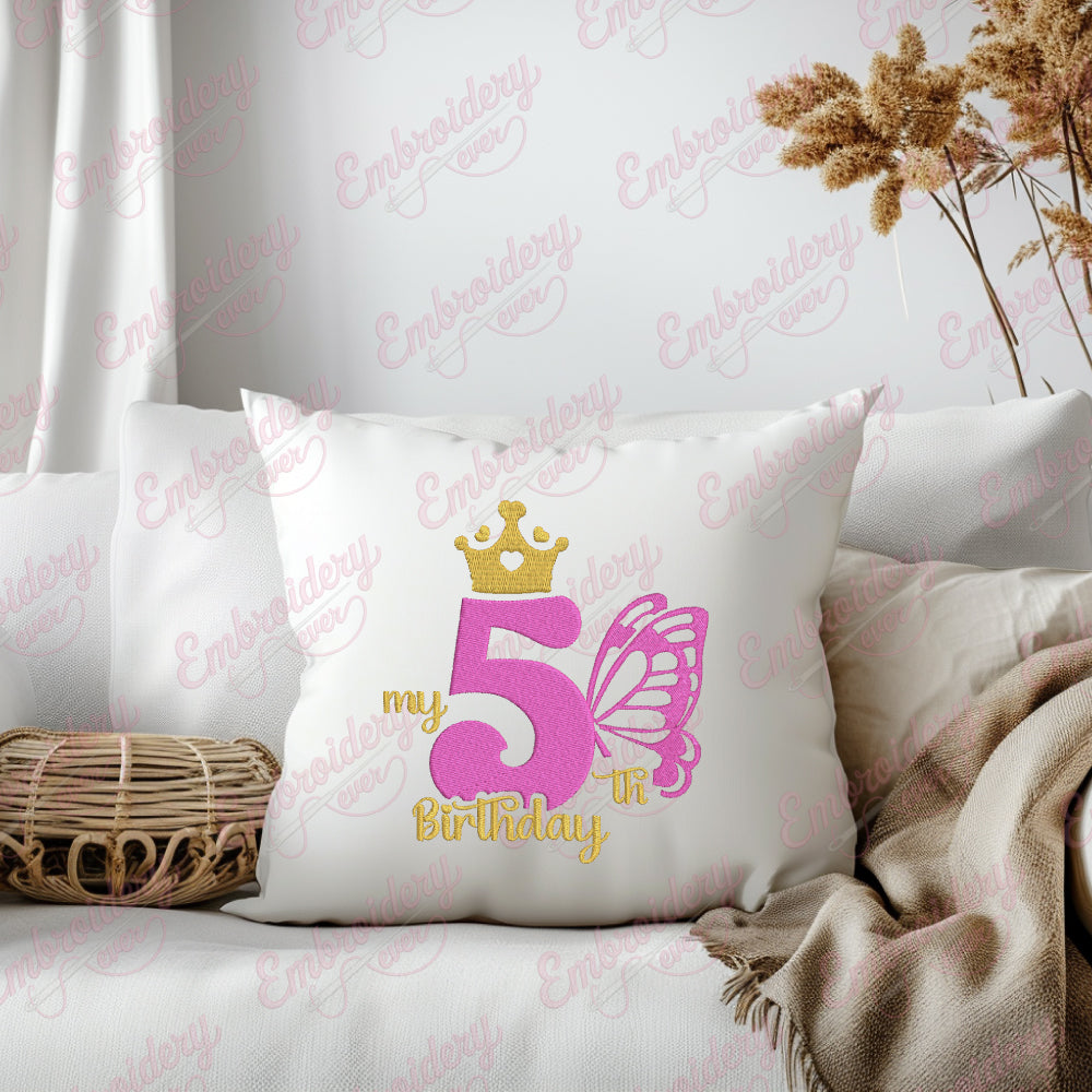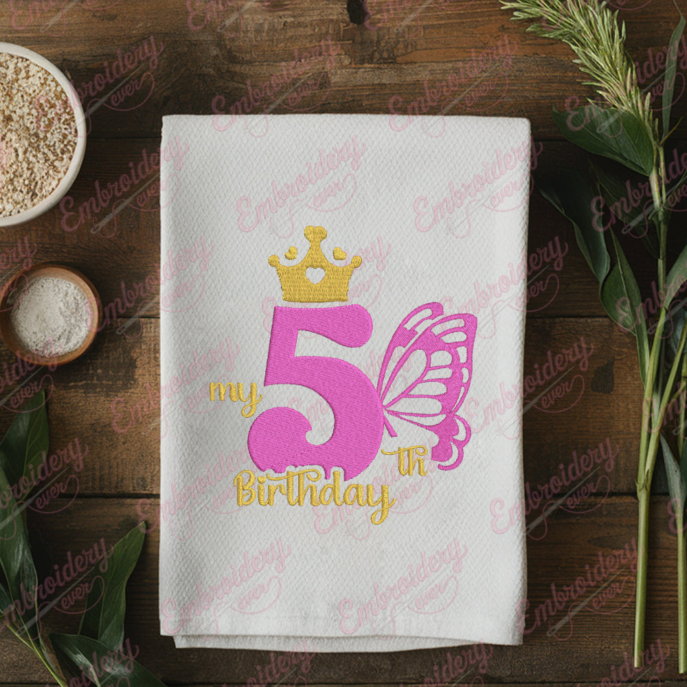 Celebrate a special milestone with the Butterfly My 5th Birthday Machine Embroidery Design, expertly crafted to bring a charming and festive touch to your projects. This design features a vibrant butterfly motif combined with the phrase "My 5th Birthday," perfectly capturing the joy and excitement of this important birthday. Ideal for decorating clothing, accessories, or keepsakes, it adds a personalized and heartfelt element to any item. The design is compatible with a wide range of embroidery machines, ensuring precise stitching and rich detail. Its playful yet elegant style makes it perfect for children’s birthday apparel, party decorations, or custom gifts that will be treasured for years.