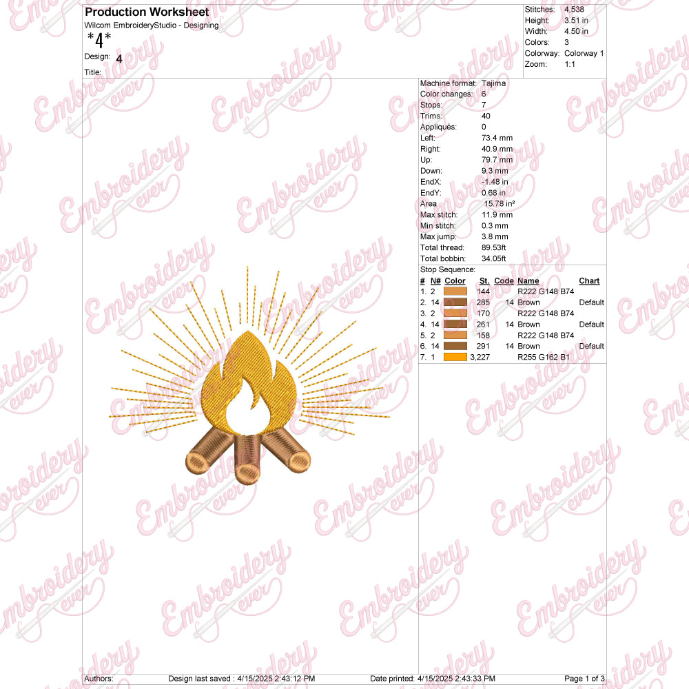 The Campfire Embroidery Design captures the warm, inviting essence of a classic campfire scene with intricate stitching that brings every detail to life. Expertly crafted, this design features flickering flames, glowing embers, and rustic logs, making it perfect for outdoor enthusiasts and nature lovers. Ideal for embellishing apparel, accessories, or home décor, it adds a cozy, handcrafted touch to any project. The precise stitch work ensures durability and a polished finish, while the balanced composition allows for easy integration into various fabric types. Elevate your embroidery collection with this timeless design that celebrates the spirit of adventure and camaraderie around the fire.