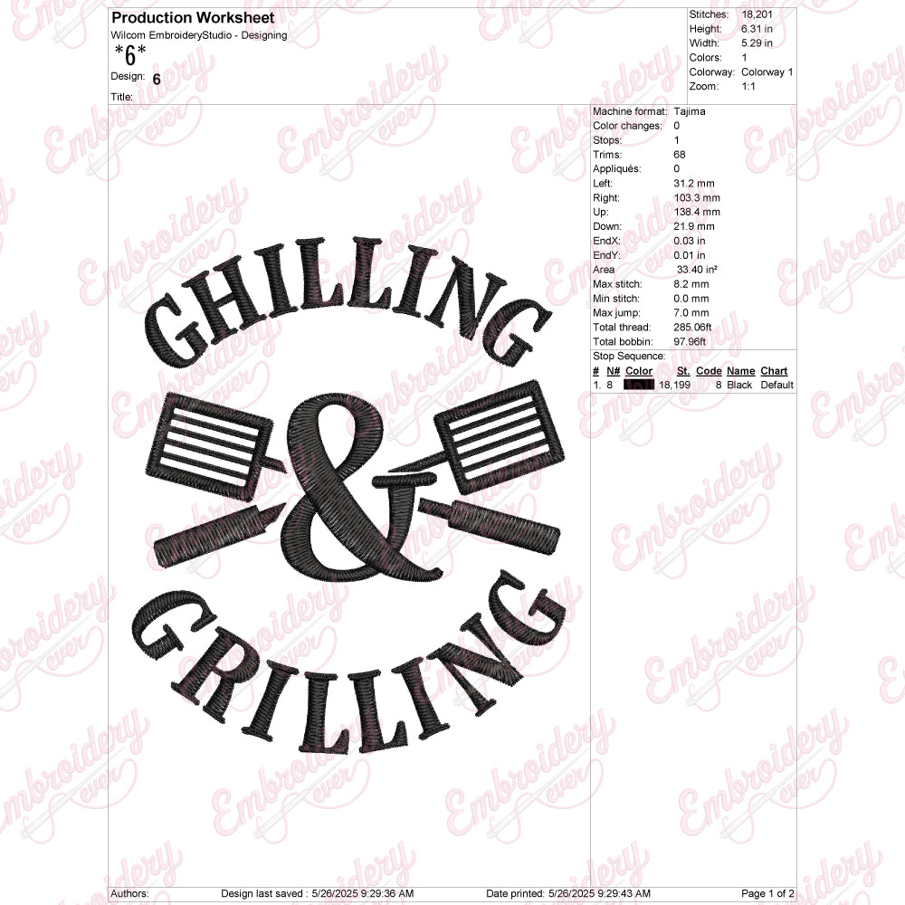 The Chilling & Grilling Embroidery Design captures the laid-back spirit of outdoor cooking and relaxation with precision and artistry. This design showcases detailed imagery that appeals to enthusiasts of backyard barbecues, combining a casual, fun vibe with a skillful stitch pattern that enhances any fabric. Ideal for customizing apparel, aprons, or kitchen linens, it offers an expert touch to your projects while conveying a sense of leisure and conviviality. Crafted for easy integration with embroidery machines, the design balances complexity and clarity, ensuring excellent visibility on various textiles. Elevate your embroidery projects with this distinct, expertly crafted motif celebrating grilling culture and downtime.