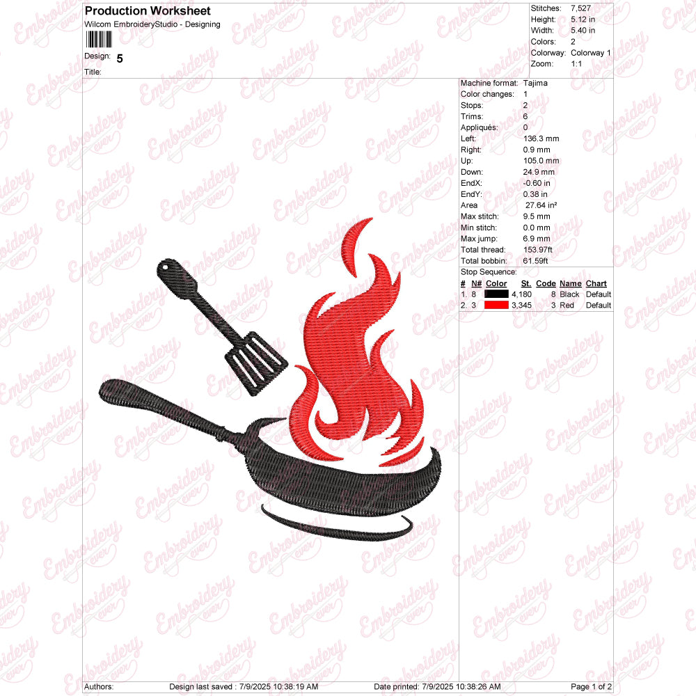 The Frying Pan With Fire Cooking Kitchen Embroidery Design captures the essence of culinary passion with intricate detail and expert craftsmanship. This design features a classic frying pan with vibrant flames rising, symbolizing the heat and energy of cooking. Perfect for kitchen linens, aprons, or chef uniforms, it adds a dynamic and professional touch to any fabric. The precise stitching ensures durability and a refined appearance, making it ideal for both personal and commercial embroidery projects. Elevate your kitchen-themed creations with this design that celebrates the art of cooking through vivid imagery and expert embroidery techniques.