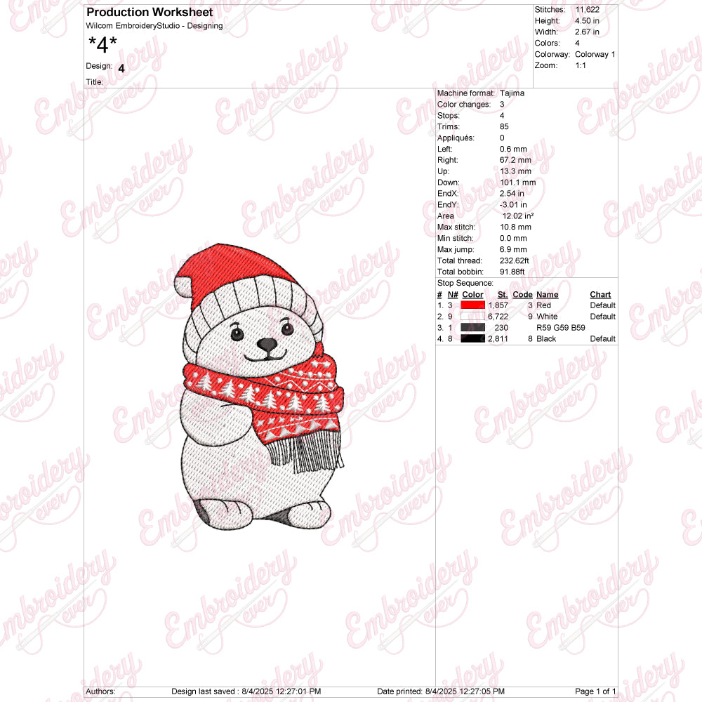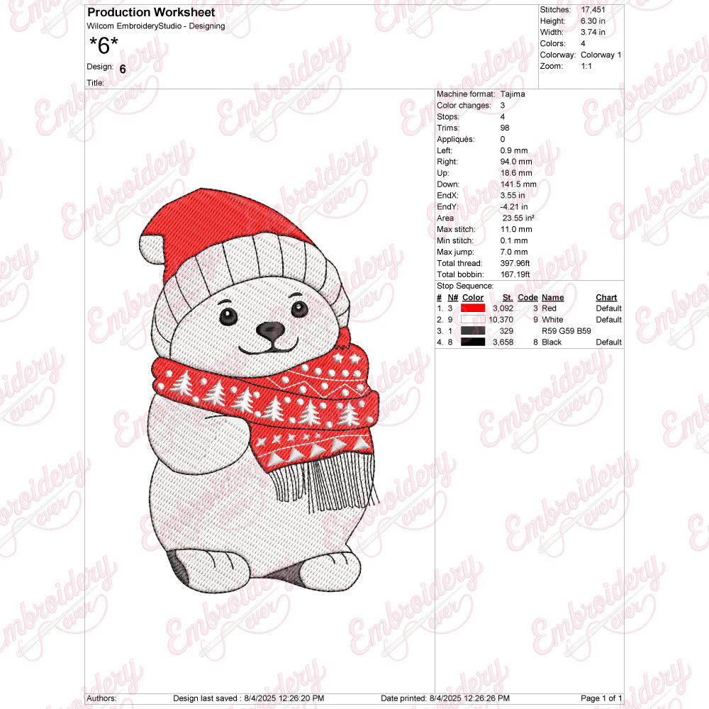 Celebrate the festive season with the Christmas Polar Bear Embroidery Design, a charming and detailed pattern perfect for holiday projects. This design features a beautifully crafted polar bear adorned with seasonal elements like holly, snowflakes, or a festive scarf, adding a cozy winter vibe. Ideal for embellishing garments, linens, or holiday decorations, it brings a touch of elegance and warmth to any fabric. The intricate stitching details ensure a sharp, professional finish, making it suitable for both experienced embroiderers and dedicated hobbyists. Enhance your seasonal creations with this timeless design that captures the spirit of Christmas in a unique, artistic way.