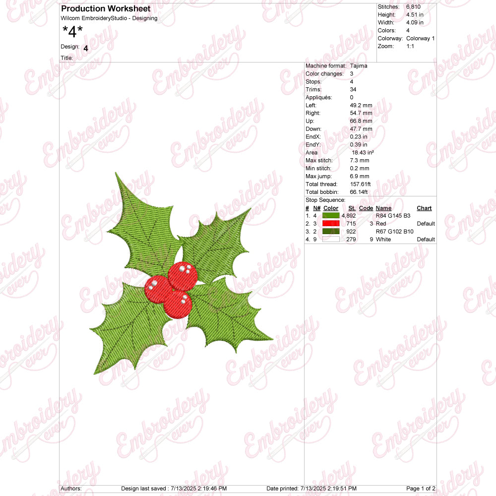 The Holly Berry Christmas Embroidery Design captures the essence of the holiday season with intricate detail and festive charm. Expertly crafted, this design features vibrant holly leaves and bright red berries, symbolizing traditional Christmas decor. Ideal for embellishing holiday linens, garments, or gift items, it adds a refined, seasonal touch. Its precise stitching ensures durability and clean edges, making it suitable for both domestic and commercial embroidery machines. Whether used to personalize gifts or create festive home décor, this design offers versatility and timeless appeal. Elevate your Christmas projects with this elegantly detailed and professionally optimized embroidery design.