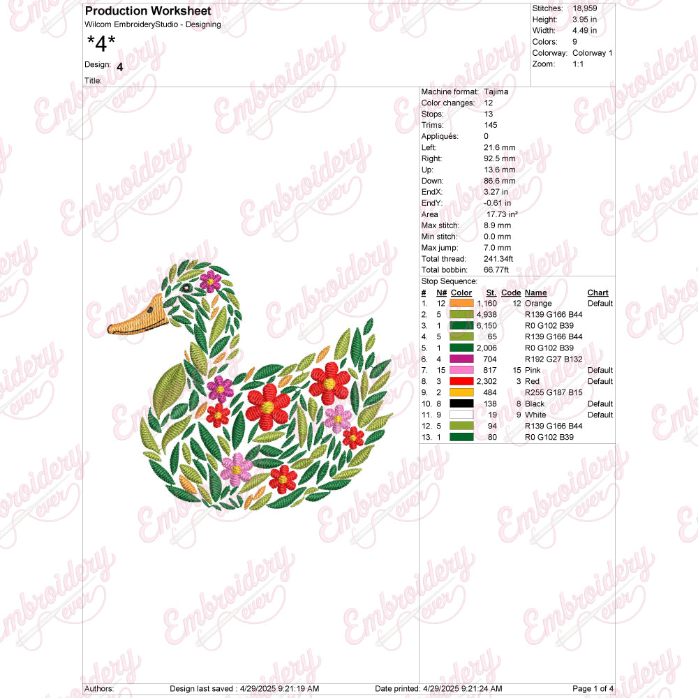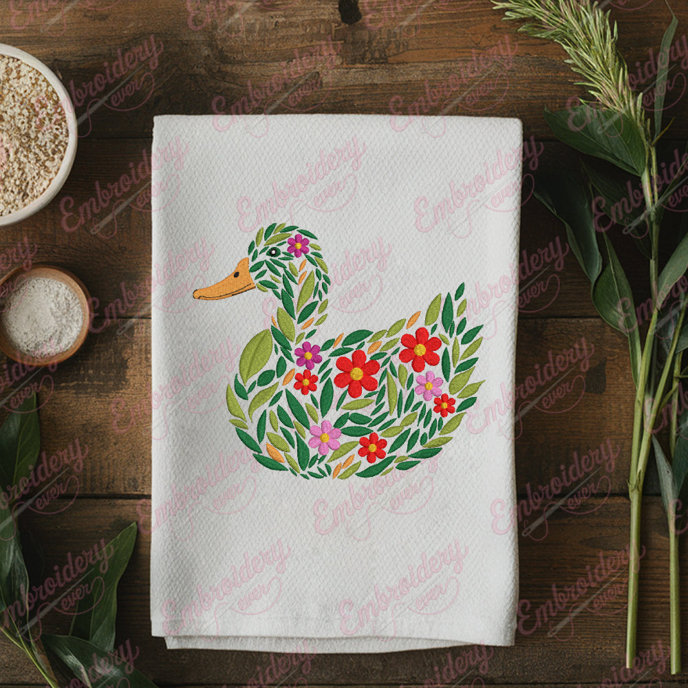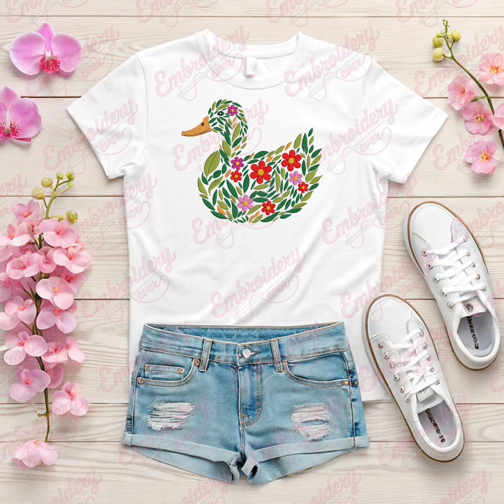 The Beautiful Floral Duck Embroidery Design masterfully combines nature's elegance with meticulous craftsmanship, making it an exceptional choice for embroidery enthusiasts seeking sophistication in their projects. This design features a charming duck silhouette intricately adorned with delicate floral patterns that provide depth and texture. Each element is thoughtfully crafted to ensure smooth stitching and vibrant detailing, ideal for adding a refined decorative touch to garments, home textiles, or accessories. Perfect for those who appreciate detailed artistry, this embroidery design elevates any fabric with its harmonious blend of wildlife and botanical motifs, reflecting expert-level precision and aesthetic balance.