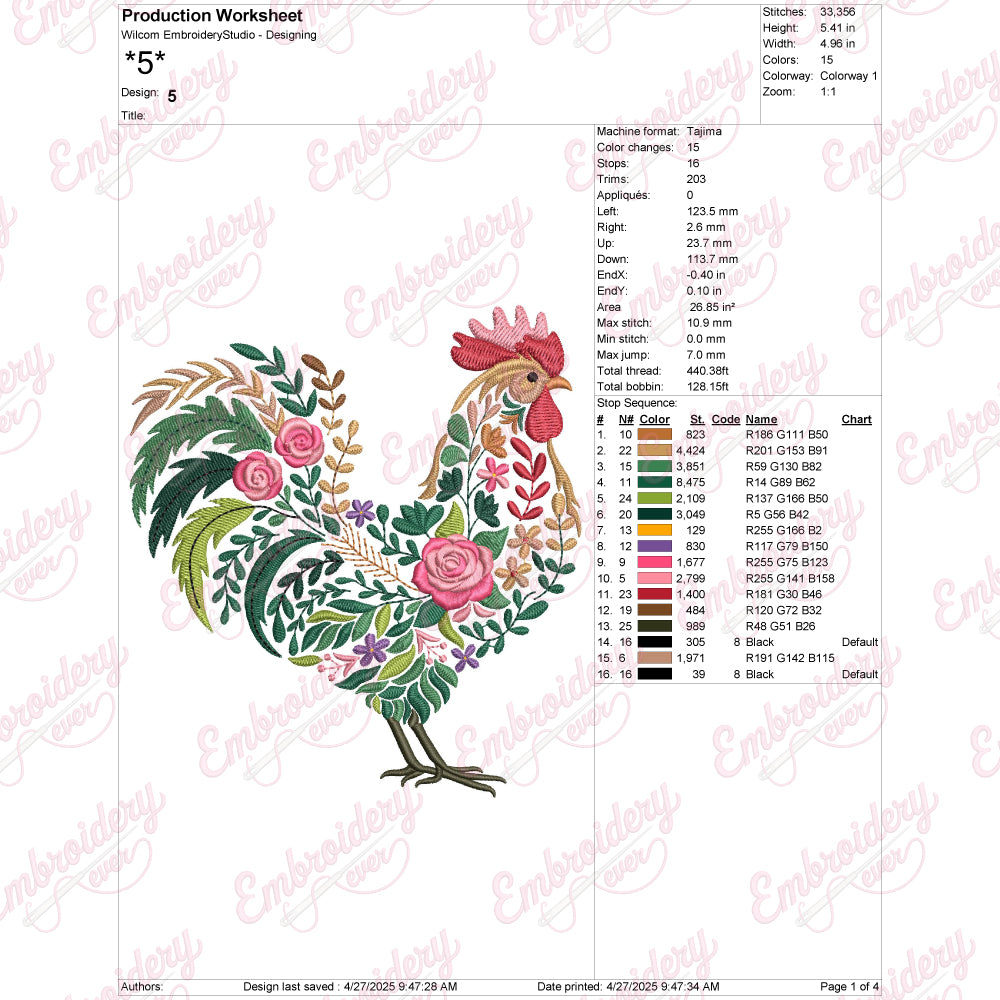 The Colorful Botanical Rooster Embroidery Design showcases a meticulously crafted rooster adorned with vibrant botanical elements, blending nature-inspired motifs with intricate stitch work. This design highlights a rich palette of colors that bring the rooster and surrounding foliage to life, adding depth and texture to any fabric surface. Expertly digitized for precise detailing, it captures fine feather patterns and delicate leaf structures, making it suitable for enhancing garments, home décor, and accessories. Perfect for embroidery enthusiasts seeking to combine animal imagery with botanical elegance, this design offers versatility and visual impact in creative textile projects.