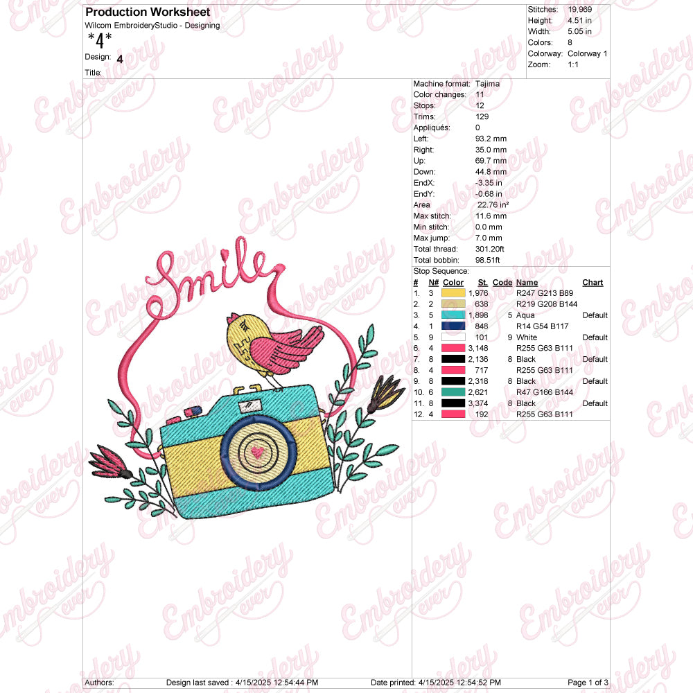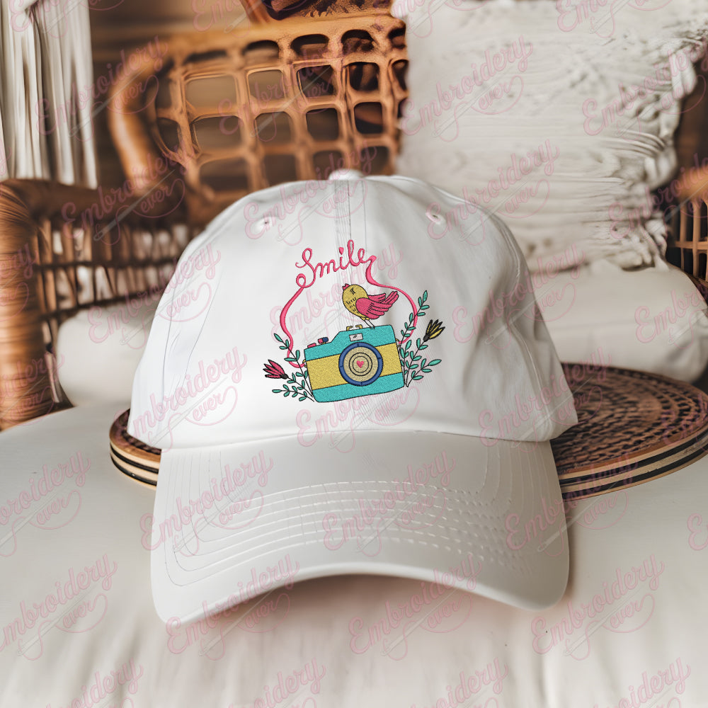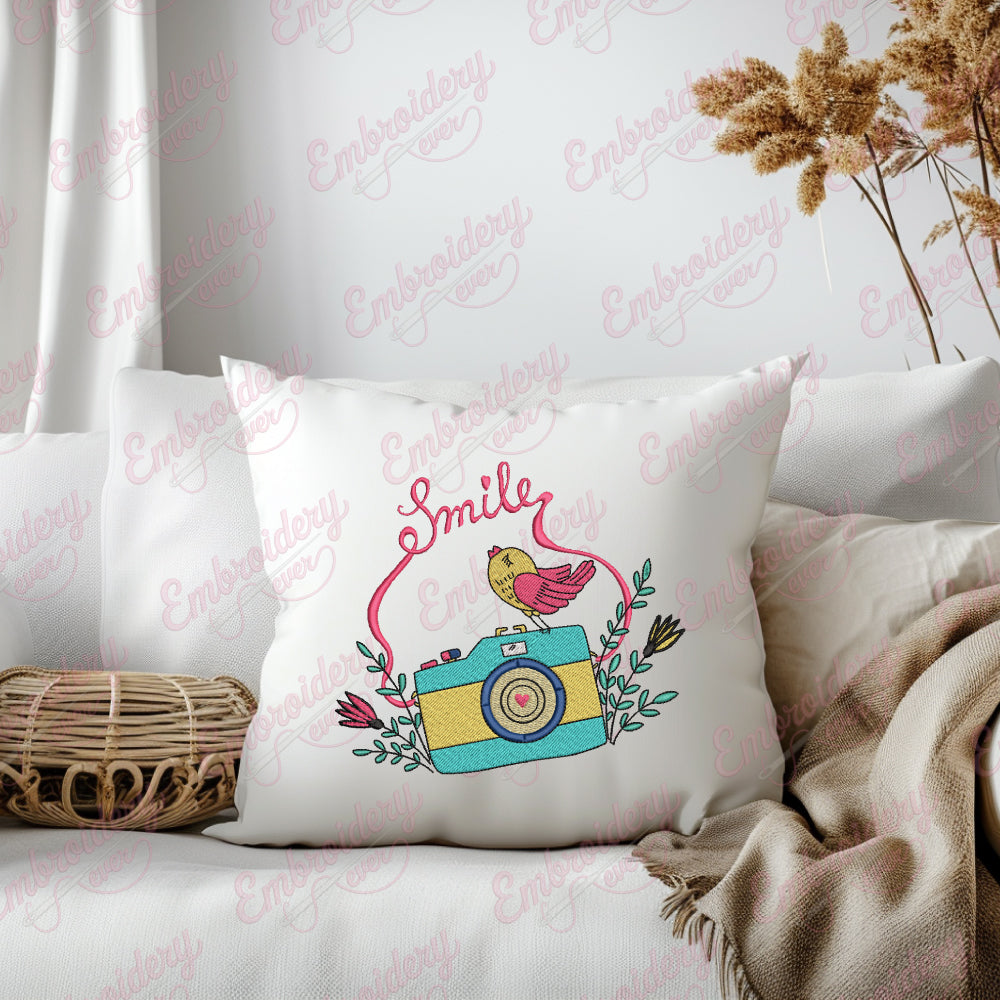 Let your creativity shine with this delightful Floral Camera Smile Bird embroidery design!