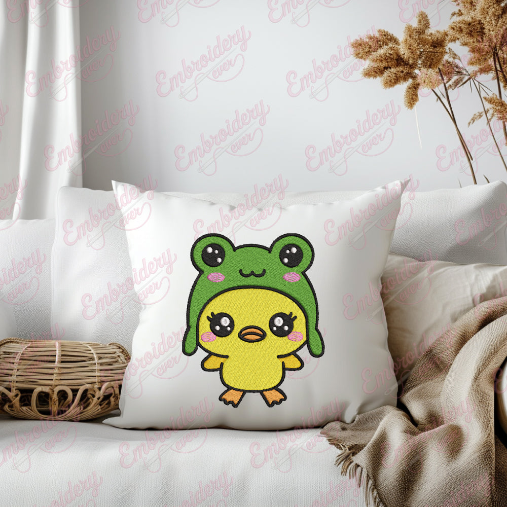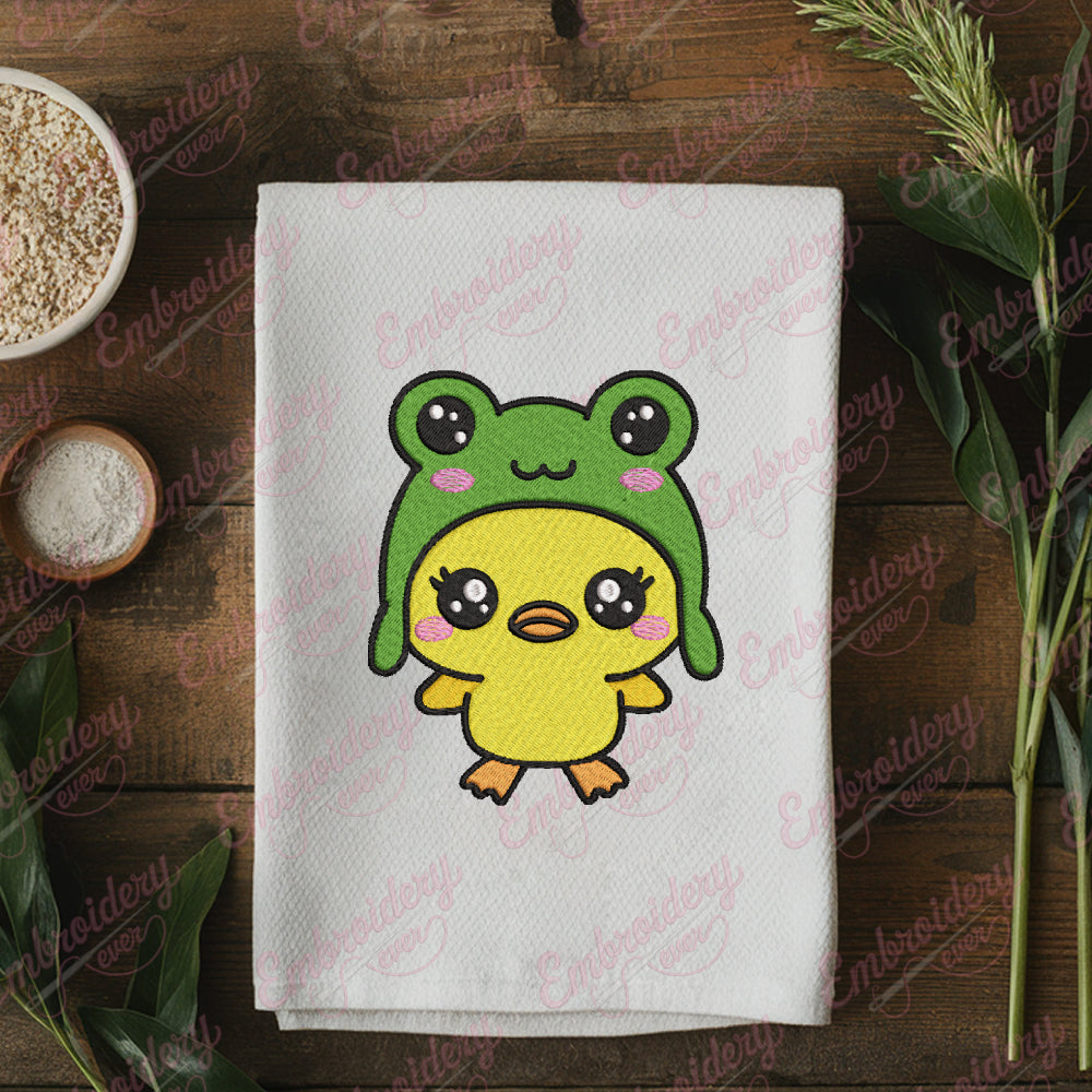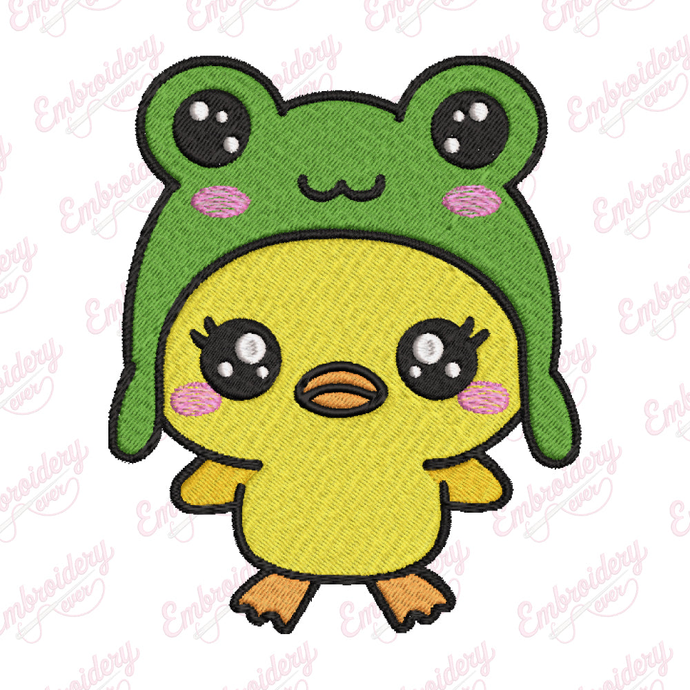 Let your creativity shine with this delightful Kawaii Duck Wearing A Frog Hat embroidery design!