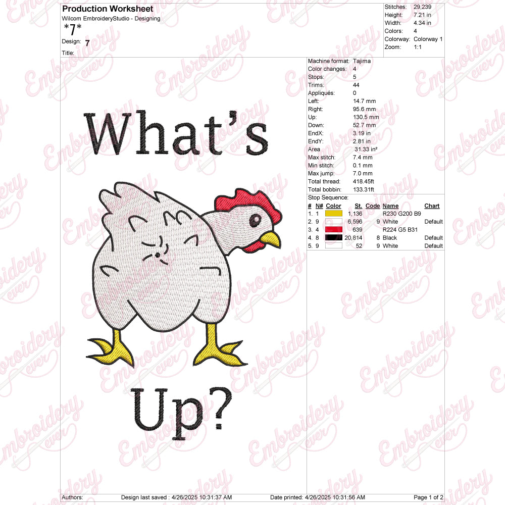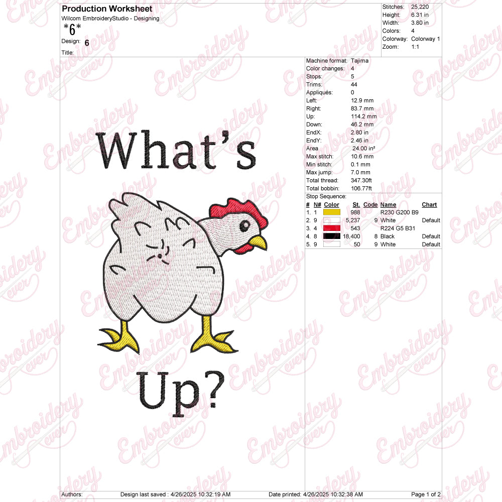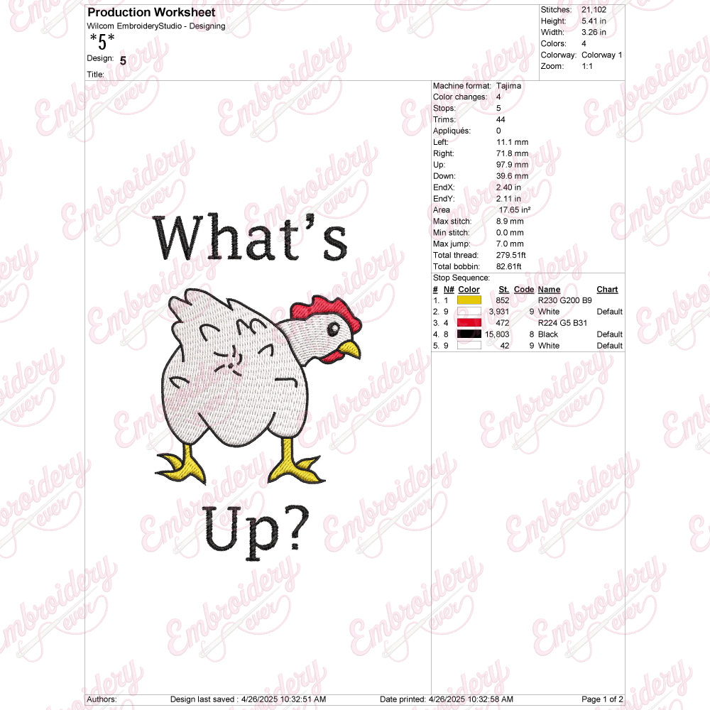 The "What's Up Chicken Butt Funny Chicken Embroidery Design" offers a playful and witty addition to your embroidery projects. This design features a charming chicken paired with the humorous phrase "What's Up Chicken Butt," making it perfect for adding a lighthearted touch to apparel, accessories, or home décor. Crafted with attention to detail, the design ensures clear stitching and vibrant expression, suitable for various fabric types. Ideal for embroidery enthusiasts seeking to inject personality and fun into their creations, this design balances humor with quality, making it a standout choice for gifts or personal use. Its versatility allows easy integration into casual wear or kitchen textiles, enhancing everyday items with a clever twist.