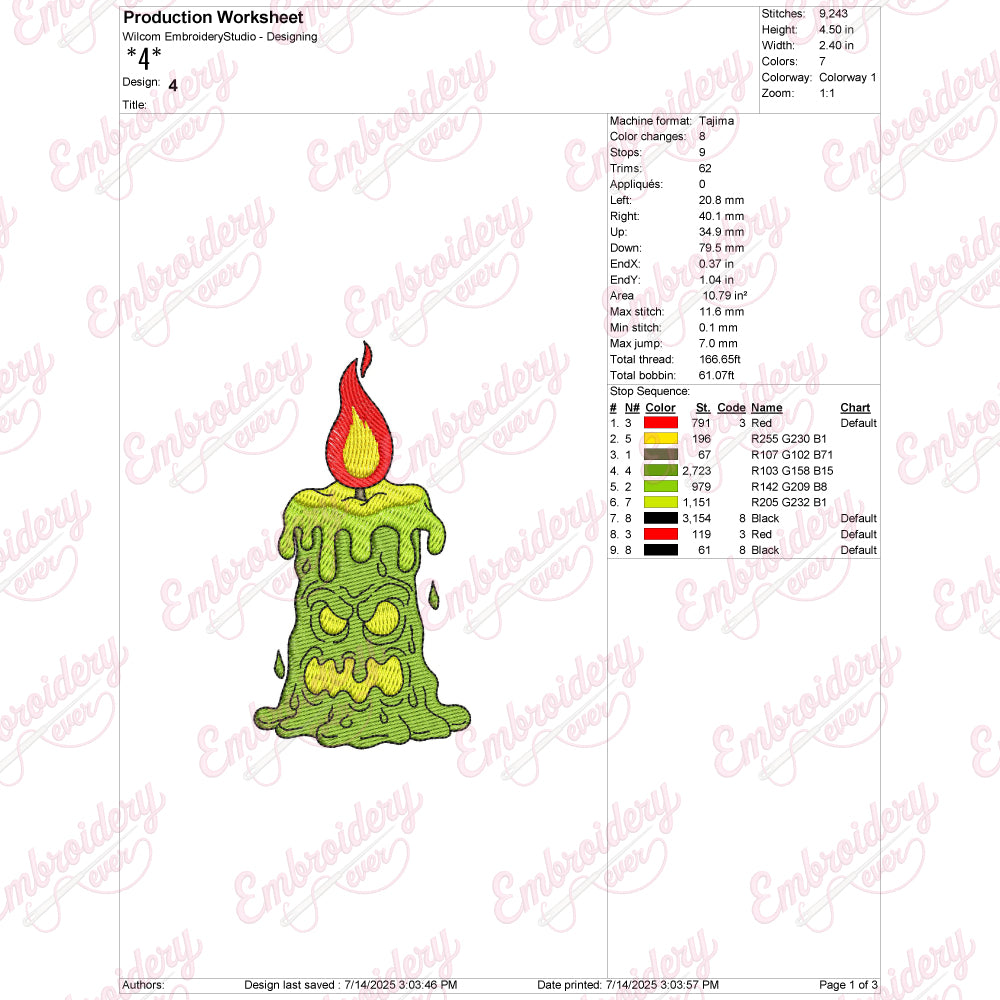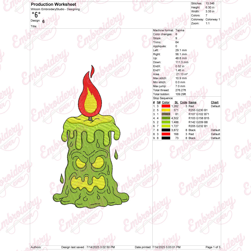 The Halloween Candle Monster Embroidery Design captures a spooky yet whimsical spirit perfect for seasonal decoration or crafting projects. This intricate design features a quirky monster shaped like a candle, complete with vivid details that highlight the flickering flame and textured body, giving your embroidery a dynamic, three-dimensional effect. Ideal for embellishing Halloween-themed garments, home textiles, or accessories, this design adds a unique, expert-level touch to any project. Its precise stitching instructions ensure crisp lines and rich texture, making it suitable for both advanced hobbyists and professional embroiderers seeking to create standout seasonal pieces.