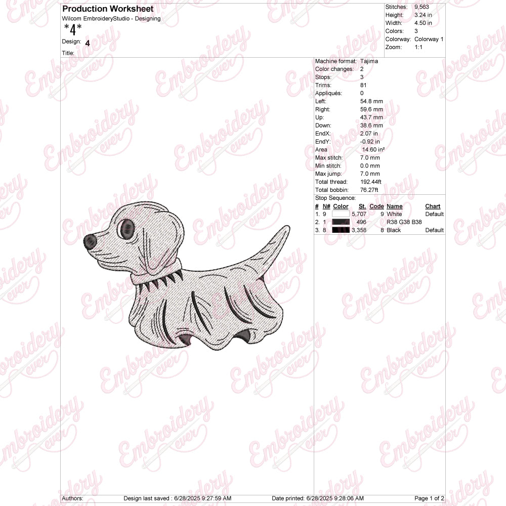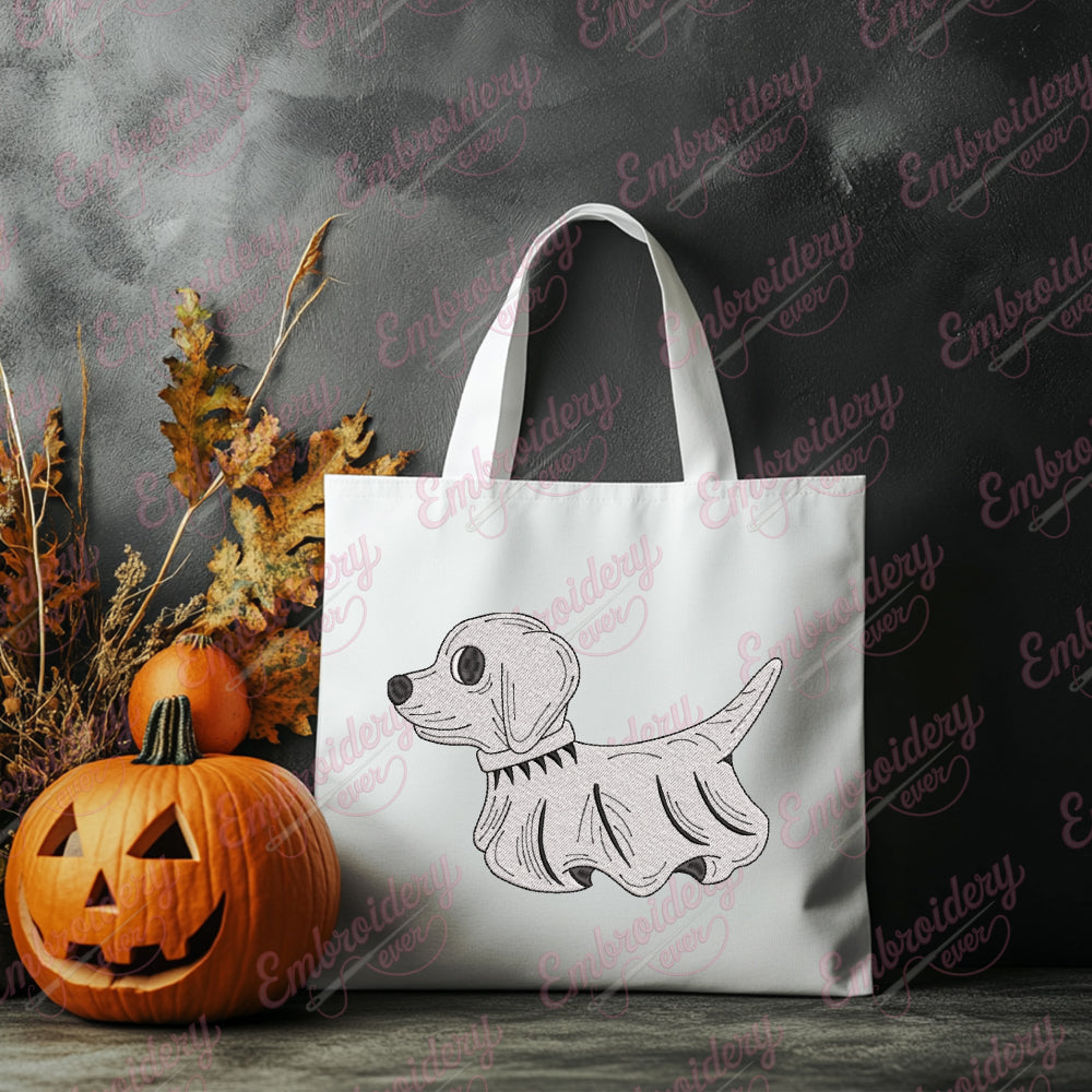 The Halloween Ghost Dog Embroidery Design offers a unique and festive motif perfect for seasonal projects. Featuring a charming dog depicted as a friendly ghost, this design blends playful Halloween spirit with pet-themed creativity. Expertly crafted details ensure crisp stitching and clear contours, making it suitable for a variety of fabric types and embroidery machines. Ideal for decorating apparel, accessories, or home décor items, this design brings a cozy yet spooky charm to your creative endeavors. Its moderate complexity balances visual appeal with practical stitch count, ensuring efficient production while maintaining high-quality results. Elevate your Halloween-themed embroidery collection with this endearing ghost dog design.