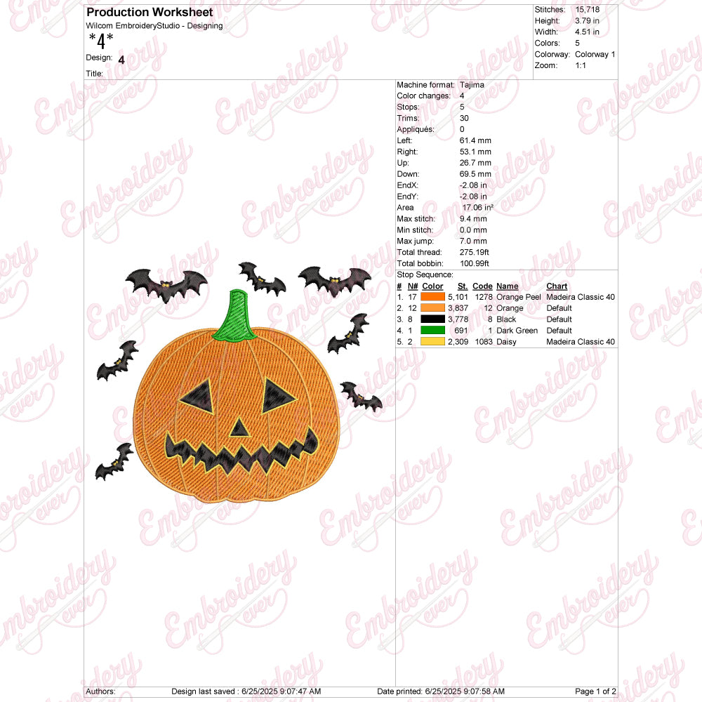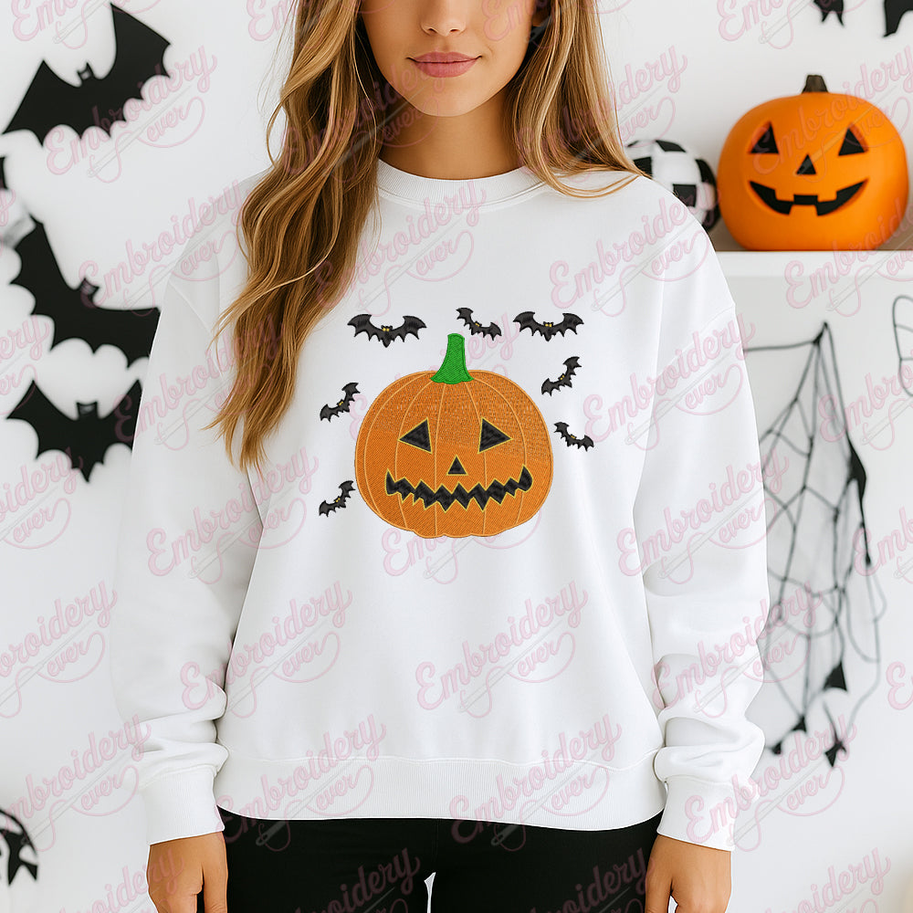 The Halloween Pumpkin Bat Embroidery Design combines classic Halloween motifs with intricate detailing to create a striking visual for your embroidery projects. Featuring a boldly carved pumpkin paired with a sleek bat in mid-flight, this design captures the eerie yet festive spirit of the season. Expertly crafted with precise stitch patterns, it ensures clear outlines and consistent texture, enhancing both appearance and durability on fabric. Ideal for decorating garments, home textiles, or holiday accessories, this design adds a professional touch that elevates your Halloween-themed creations. Its balanced composition and scalable size make it adaptable for a variety of embroidery machines and fabric types.