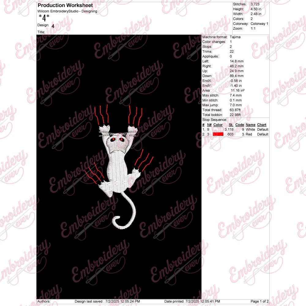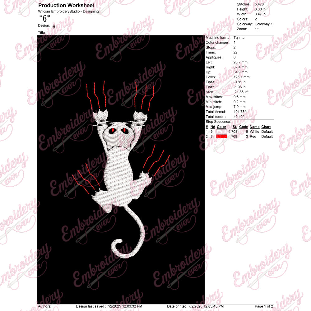 The Halloween Scratching Cat Embroidery Design captures the eerie spirit of Halloween with a detailed and dynamic depiction of a cat in mid-scratch. This design features sharp, clean lines and intricate stitching that highlights the cat’s fur texture and motion, making it a standout piece for seasonal projects. Ideal for embellishing garments, accessories, or home décor, it brings a spooky yet charming element to your embroidery work. The design’s precise stitch count and color layering options ensure crisp results on a variety of fabric types, providing both durability and visual appeal. Perfect for expert embroiderers seeking to add a thematic accent to their collection.