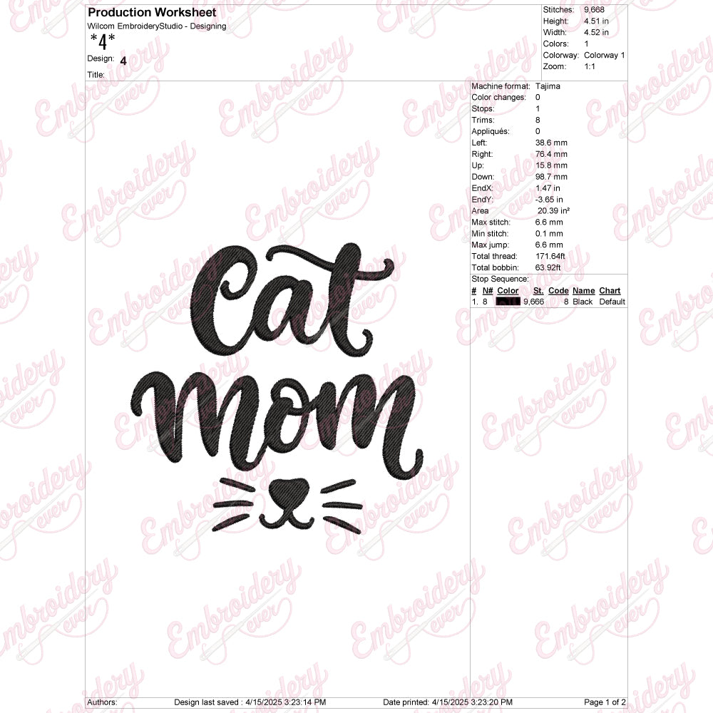 Celebrate your love for feline companions with the Cat Mom Embroidery Design, expertly crafted to bring charm and personality to your projects. This design features intricate stitching that captures the affectionate spirit of cat moms, making it perfect for personalizing apparel, accessories, or home décor. Its detailed lines and balanced composition ensure a professional finish, whether embroidered on cotton, denim, or linen fabrics. Ideal for embroidery enthusiasts seeking to express their passion for cats, this design adds a heartfelt touch to gifts or personal items. Elevate your embroidery work with this thoughtfully designed motif that resonates with cat lovers everywhere.