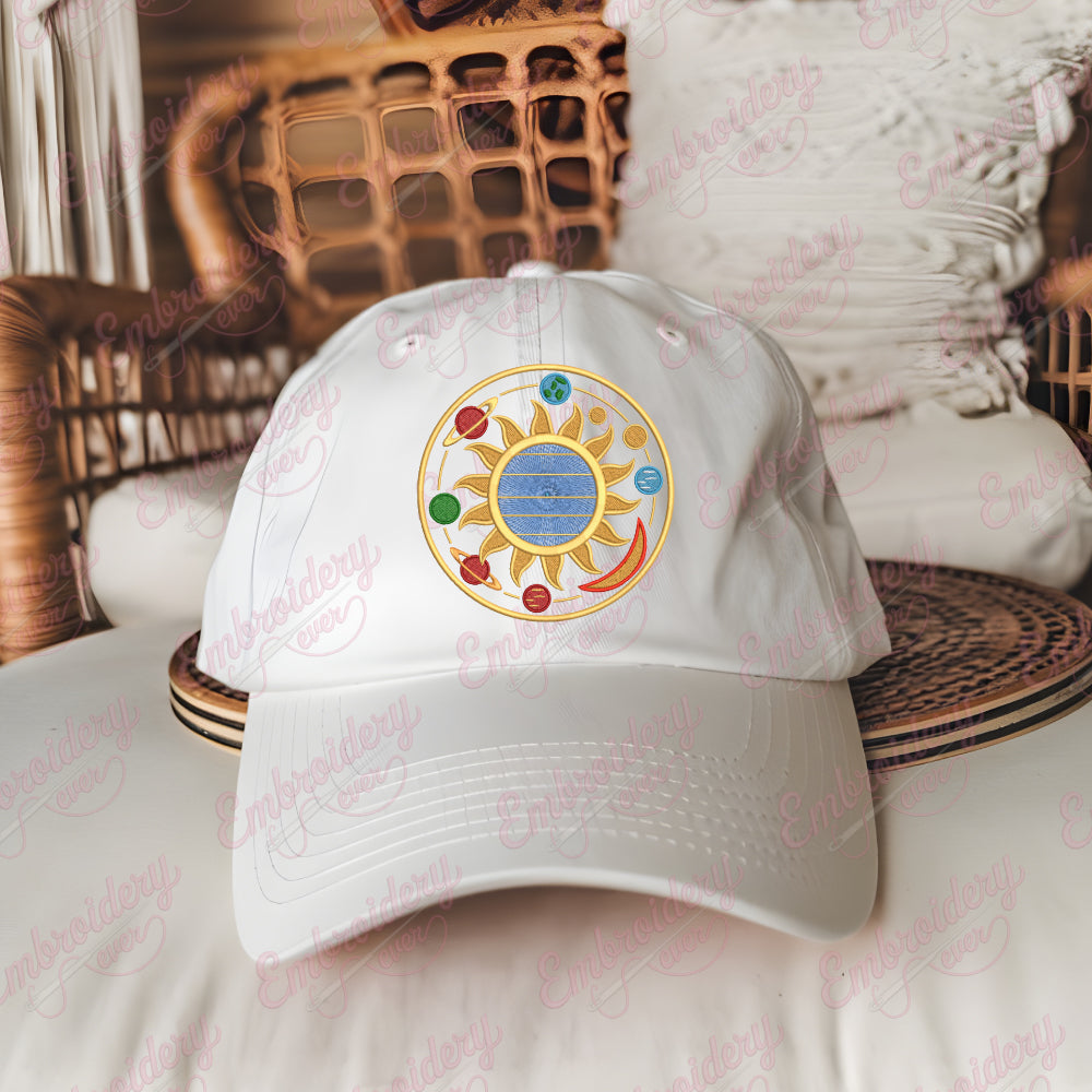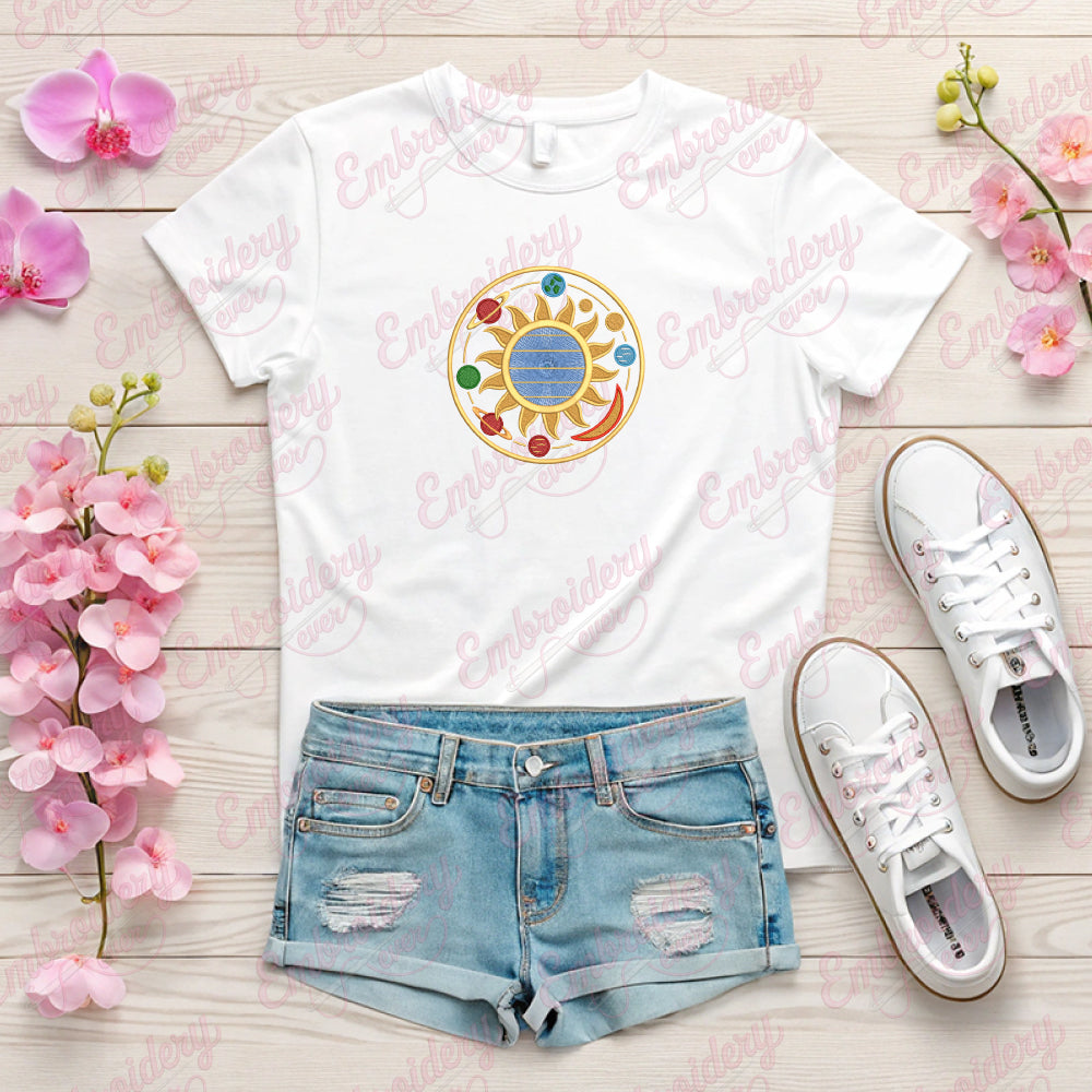 The Sun and Planets Emblem Embroidery Design offers a detailed representation of our solar system's key celestial bodies, artfully arranged around a radiant sun motif. This design captures the intricate orbital layout with precision, making it ideal for those seeking to incorporate astronomy themes into textile projects. Expertly digitized to maintain sharpness and clarity in stitching, it suits various fabric types and embroidery methods. The design’s balanced composition allows it to serve as a striking emblem on garments, accessories, or home décor items. By choosing this embroidery design, you ensure a blend of scientific inspiration and artistic craftsmanship that enhances any project with cosmic elegance.