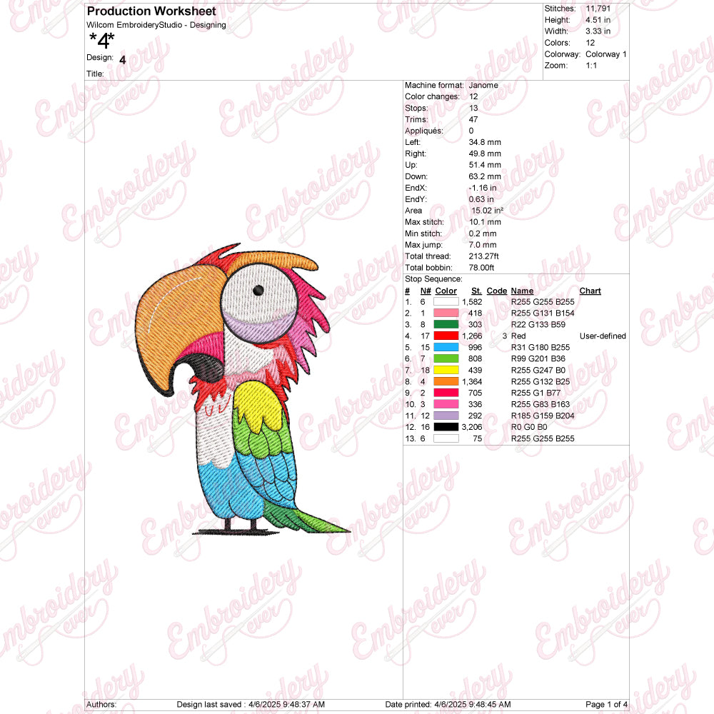 Macaw Parrot Digital Download Machine Embroidery Design