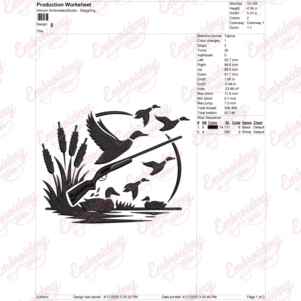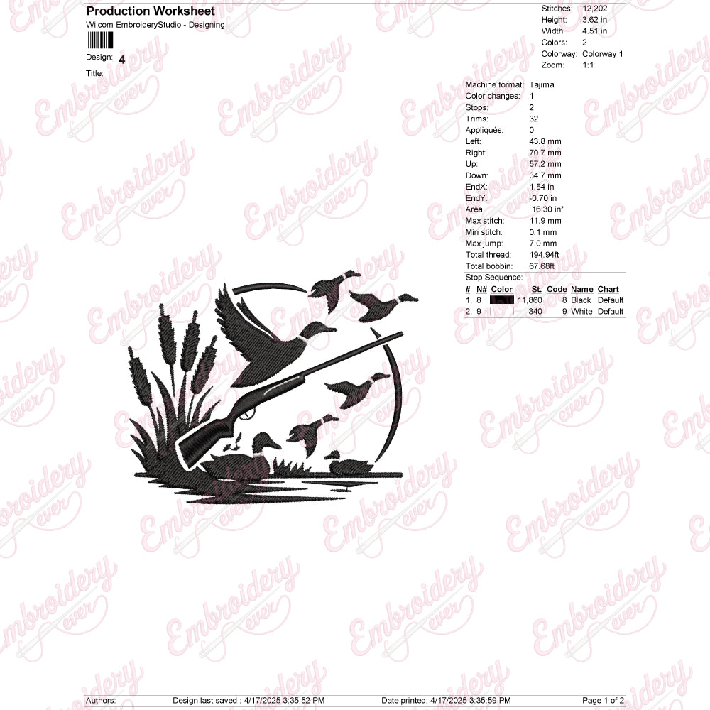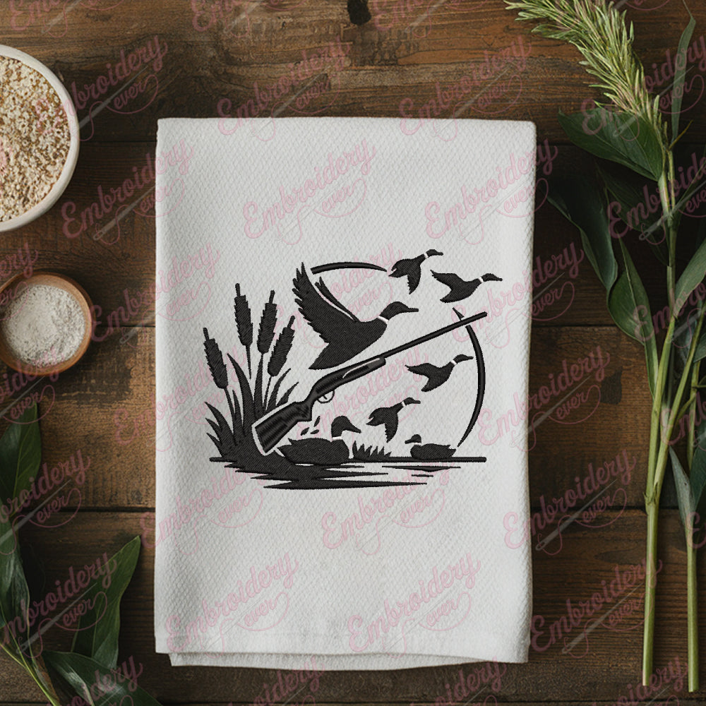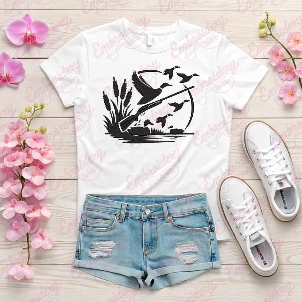 The Duck Hunting Embroidery Design captures the essence of the outdoor sport with intricate detail and expert craftsmanship. This design features a dynamic depiction of ducks in flight, showcasing fine stitching that highlights feathers and movement, ideal for enhancing hunting gear, jackets, hats, or bags. Crafted for durability, the embroidery maintains its vibrant colors and sharp lines even after repeated use and washing. Perfect for enthusiasts who appreciate both the art of hunting and quality embroidery, this design adds a personalized, professional touch to your apparel or accessories. Its detailed execution ensures a standout finish that reflects passion and expertise in duck hunting culture.