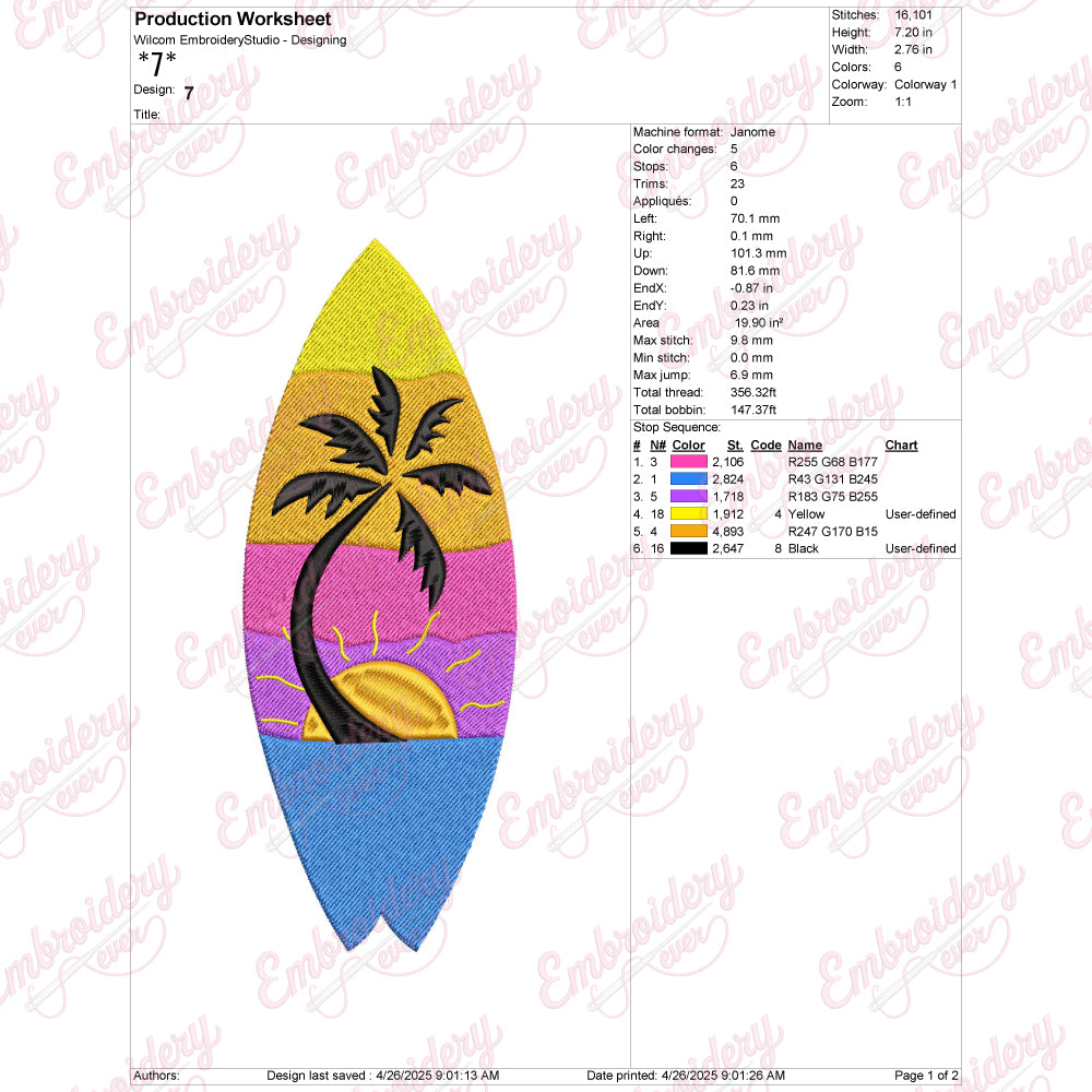 The Retro Surfboard Embroidery Design captures the timeless spirit of classic surf culture with intricate detailing and vibrant colors. This design features a vintage-style surfboard adorned with bold stripes and subtle shading that evoke a nostalgic beach vibe. Expertly crafted for embroidery, it ensures clean stitching and durability on various fabric types. Ideal for enhancing apparel, accessories, or home décor, this design adds a touch of retro charm and personality. Whether used on jackets, bags, or hats, it offers a unique way to celebrate surfing heritage with precision and style, making it a standout choice for enthusiasts and creators alike.