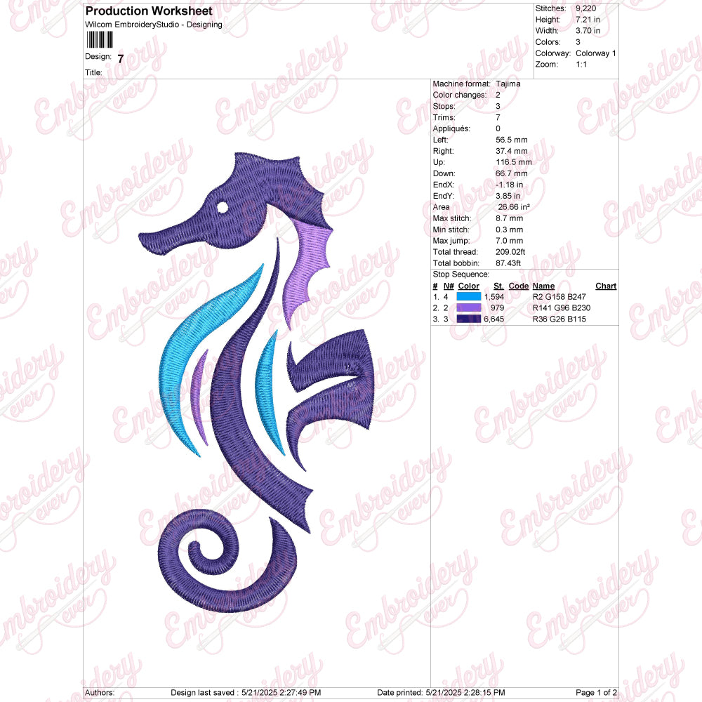 The Elegant Seahorse Embroidery Design captures the delicate beauty and intricate details of this marine creature, making it an exceptional addition to any fabric project. Crafted with precision, the design features fine lines and graceful curves that highlight the seahorse’s distinctive form and texture. Ideal for embellishing clothing, accessories, or home décor, this embroidery pattern adds a refined, sophisticated touch. Its balanced composition ensures easy integration onto various fabric types and sizes, while the elegant detailing allows for nuanced color blending and shading. Perfect for those seeking a serene, artistic marine motif with professional-quality craftsmanship.