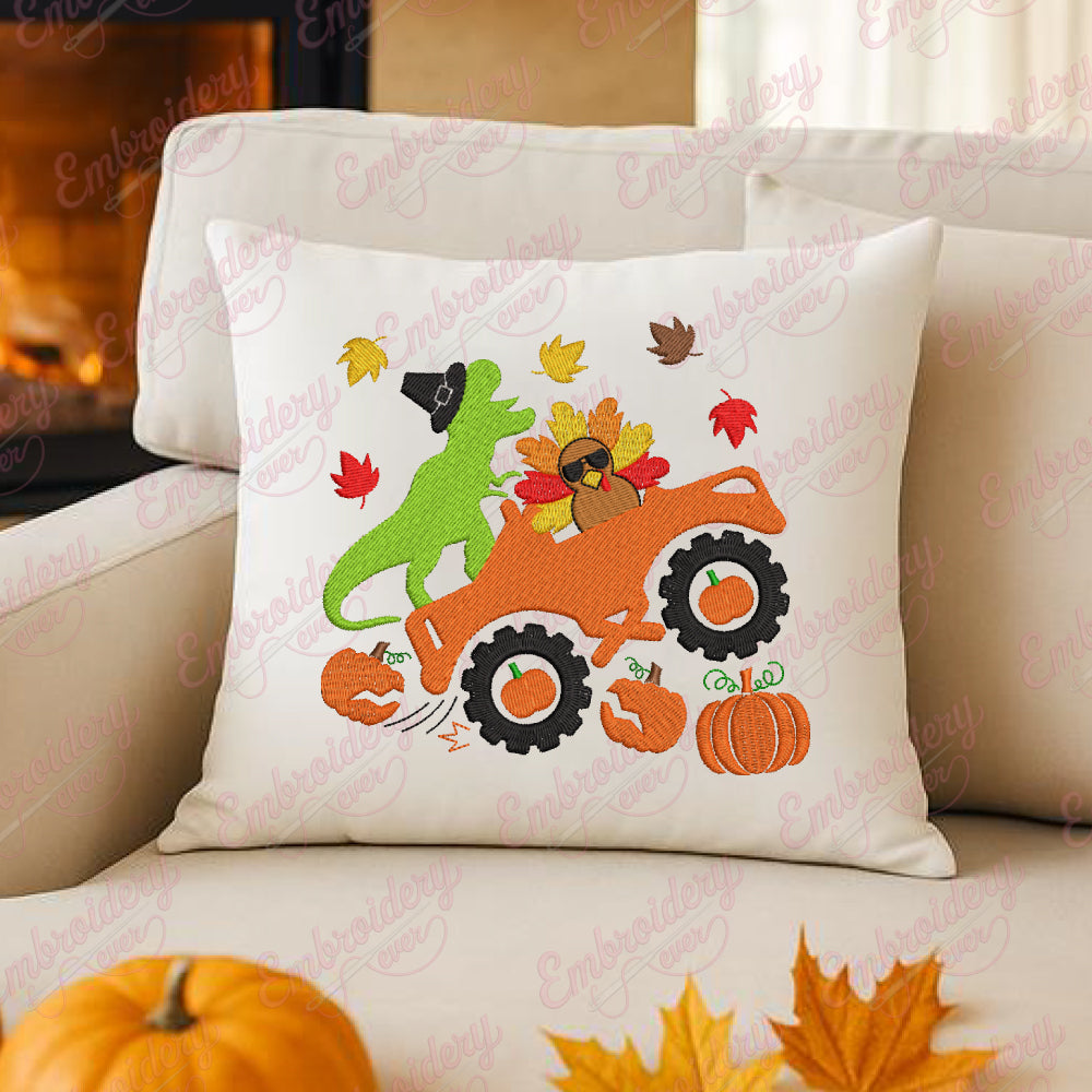 Celebrate the spirit of Thanksgiving with the Dino & Turkey's Fall Ride Monster Truck Thanksgiving Embroidery Design, a vibrant and playful artwork perfect for autumn projects. This intricately detailed design features a cheerful dinosaur and a festive turkey sharing a thrilling monster truck ride amid fall foliage, capturing the joy and excitement of the season. Expertly crafted, it brings together whimsical characters and seasonal elements with crisp lines and rich colors suitable for various fabrics. Ideal for apparel, home décor, or gifts, this design adds a unique, festive touch while showcasing quality embroidery artistry perfect for crafters seeking a standout holiday motif.