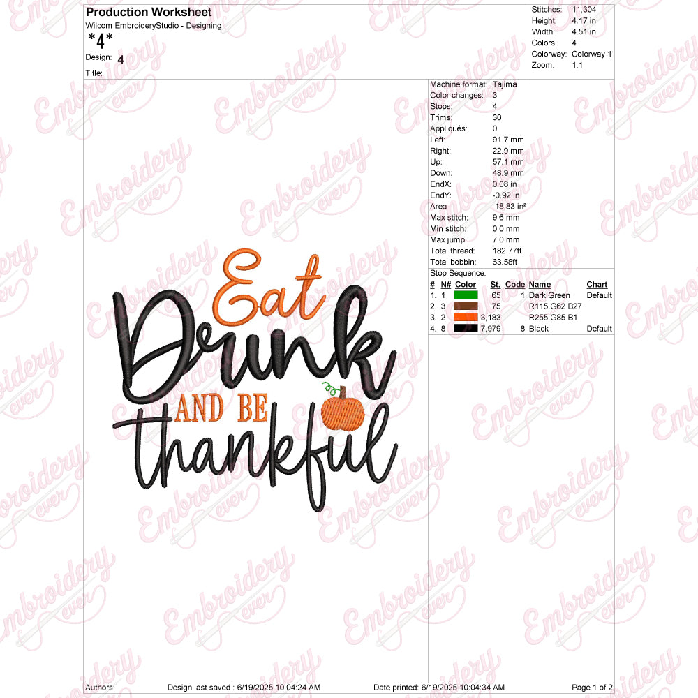 Celebrate the spirit of gratitude with the "Eat Drink And Be Thankful Thanksgiving Embroidery Design," expertly crafted to enhance your seasonal projects. This intricate design combines elegant typography with festive elements, making it a perfect addition to table linens, decorative pillows, or holiday apparel. The detailed stitching ensures durability and a refined finish, capturing the warmth and togetherness of Thanksgiving gatherings. Ideal for both machine and hand embroidery, it allows crafters to create personalized, heartfelt gifts or home décor that resonates with tradition. Elevate your holiday creations with this timeless design that brings thanks, joy, and style to any Thanksgiving setting.