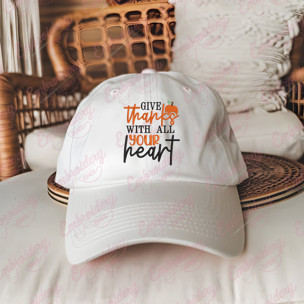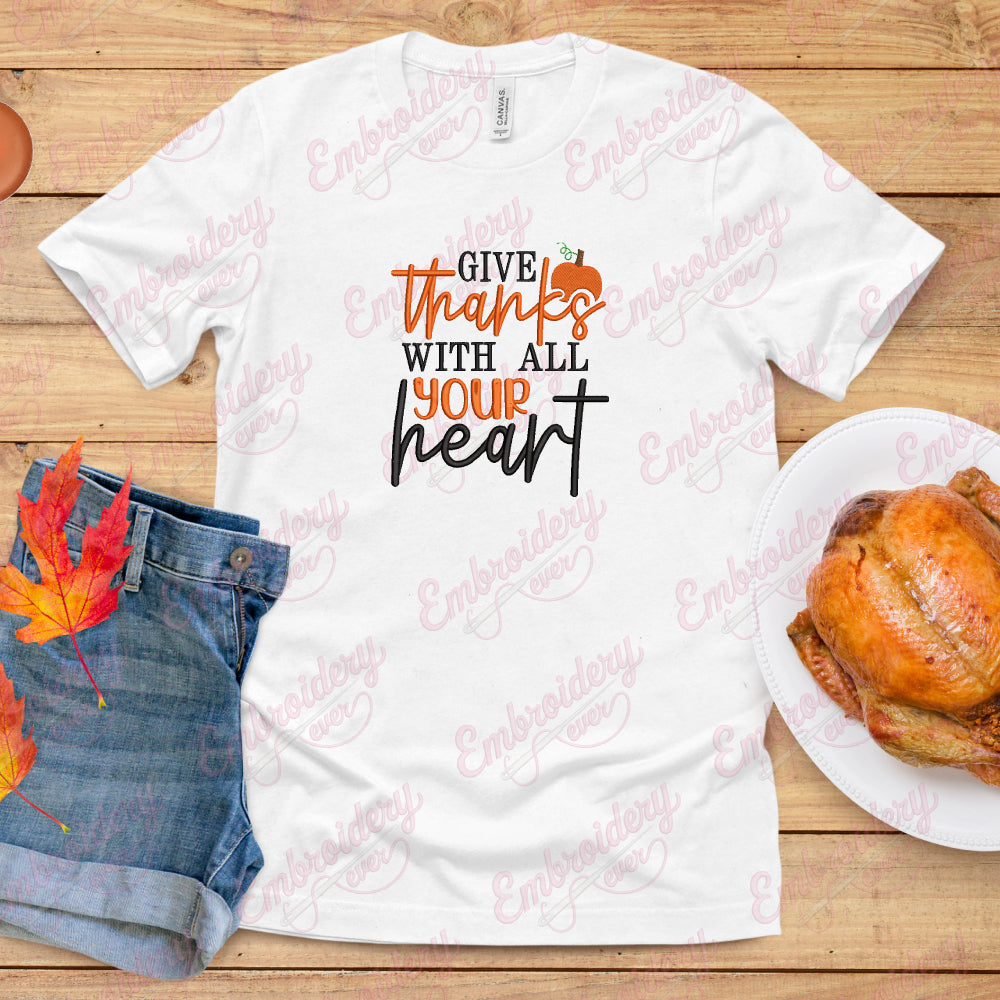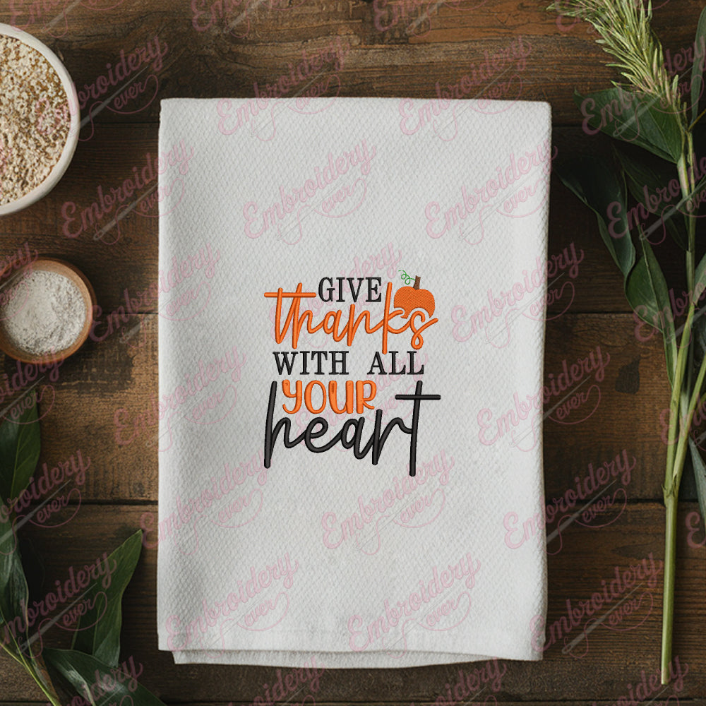 Celebrate the spirit of gratitude this Thanksgiving with the "Give Thanks With All Your Heart" embroidery design. Expertly crafted, this design captures heartfelt appreciation through elegant lettering and seasonal motifs, perfect for enhancing home décor items like table runners, napkins, and festive pillows. Its detailed stitching ensures durability and a polished finish, making your projects stand out with professional quality. Whether you're creating personalized gifts or adding a warm touch to your holiday decorations, this design offers versatility and timeless charm. Elevate your celebratory crafts with this meaningful embroidery design that embodies thankfulness in every stitch.