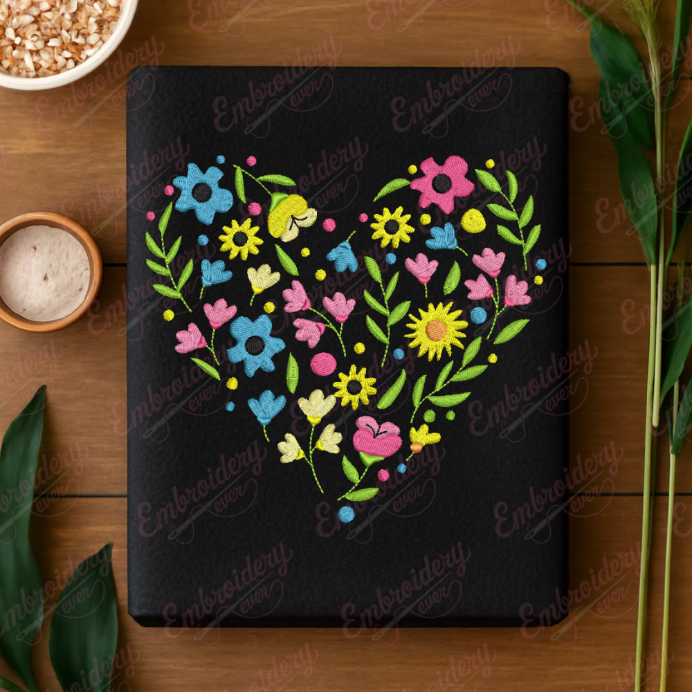 The Heart Shaped Colorful Flowers Embroidery Design offers a vibrant and intricate pattern perfect for enhancing textiles with a touch of elegance and charm. This design features a carefully crafted heart outline filled with a variety of colorful floral motifs, showcasing detailed stitching that highlights each petal and leaf. Ideal for use on garments, accessories, or home décor items, it brings a sophisticated yet lively aesthetic. The combination of vivid colors and precise embroidery techniques ensures durability and visual appeal, making it suitable for both personal projects and professional applications. This design allows artisans to add a heartfelt, artistic element to their creations with expert-level detail and craftsmanship.