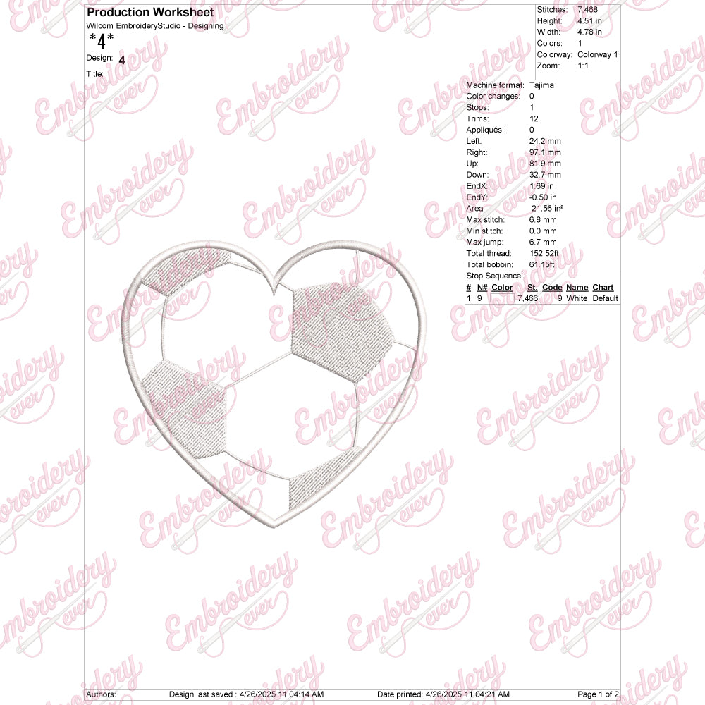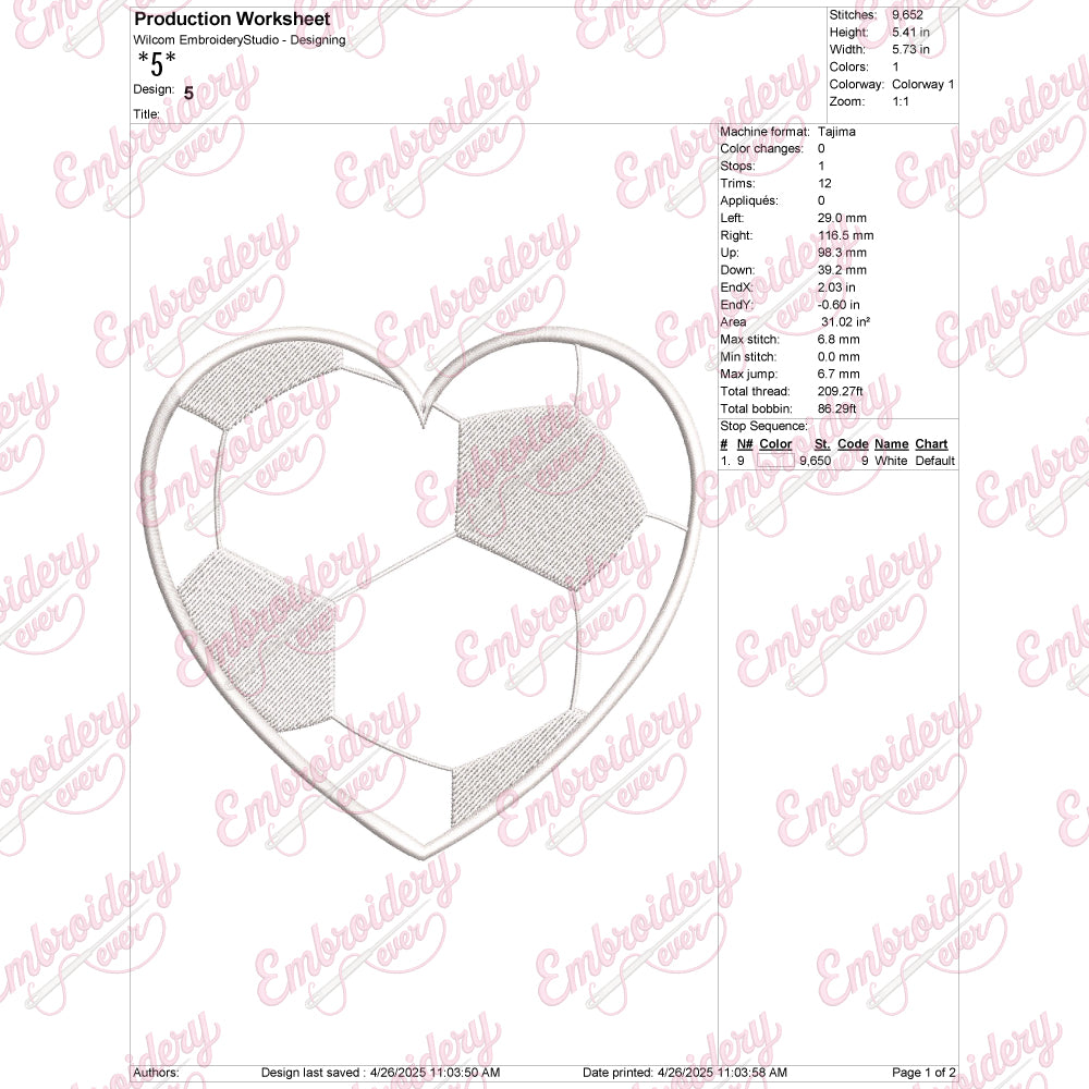 The Soccer Ball Heart Embroidery Design expertly combines the passion for soccer with a heartfelt symbol, creating a unique and meaningful motif. This design features a detailed soccer ball seamlessly integrated into the shape of a heart, symbolizing love and dedication to the sport. Ideal for embellishing sportswear, fan apparel, or personalized gifts, it adds a touch of personality and enthusiasm. Crafted with precision, the design ensures clear lines and balanced proportions, making it suitable for various fabric types and embroidery machines. Its versatile size and intricate detailing make it perfect for both casual and professional embroidery projects, celebrating the spirit of soccer with style and emotion.