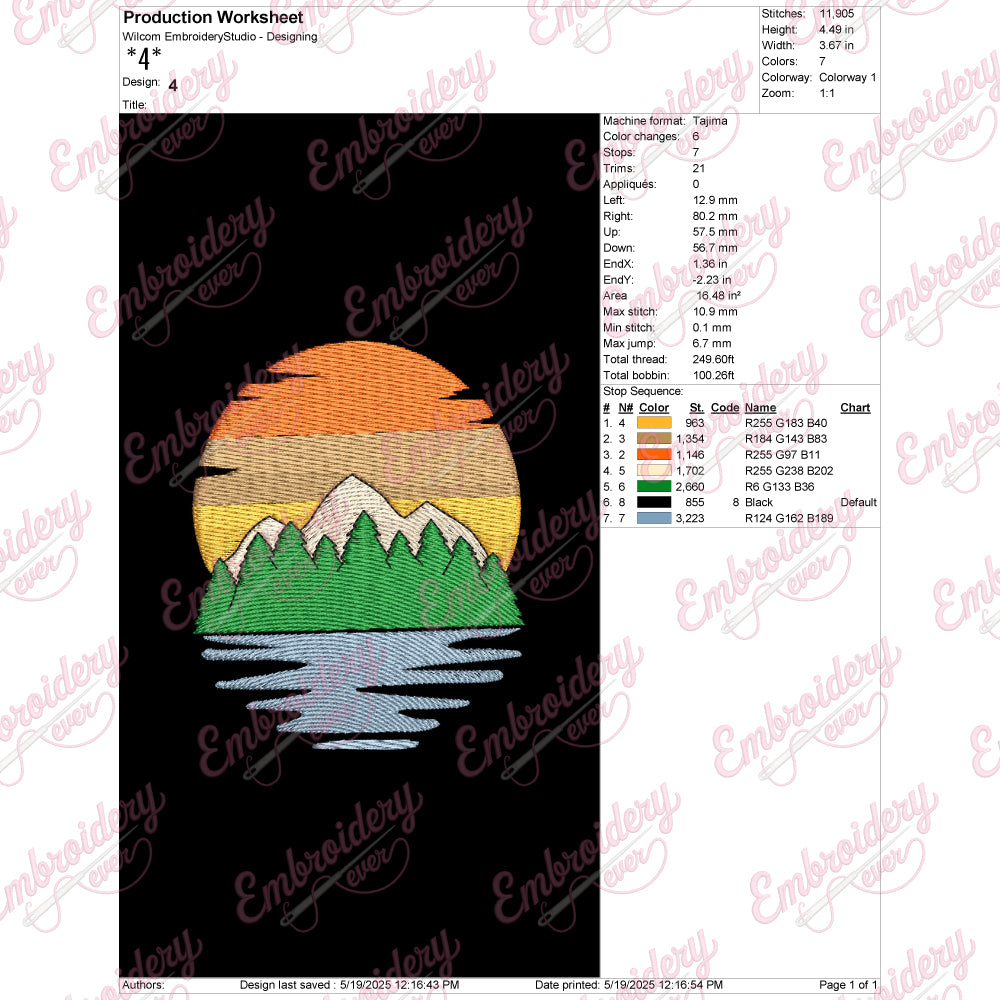 The Sunset Mountain Embroidery Design captures the serene beauty of a mountainous landscape at dusk, perfectly balancing intricate detail with artistic simplicity. Featuring layered peaks illuminated by the warm hues of a setting sun, this design utilizes a sophisticated stitch palette to create depth and texture, bringing the natural scene to life on fabric. Ideal for outdoor enthusiasts and nature lovers, it adds a refined touch to apparel, accessories, or home décor. Its precise stitch work ensures durability while maintaining an elegant aesthetic. Whether applied on jackets, bags, or wall hangings, this design offers timeless charm and expert craftsmanship suitable for a variety of embroidery projects.