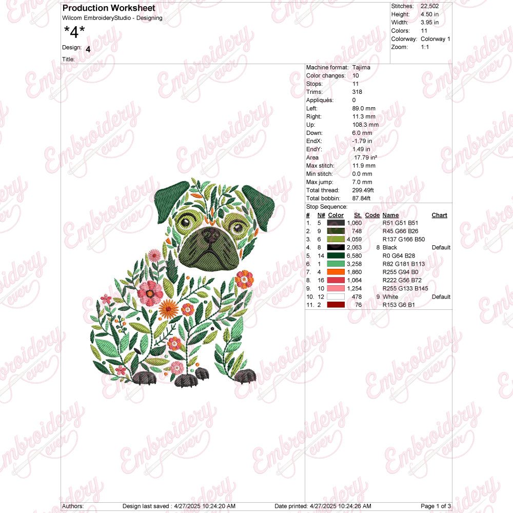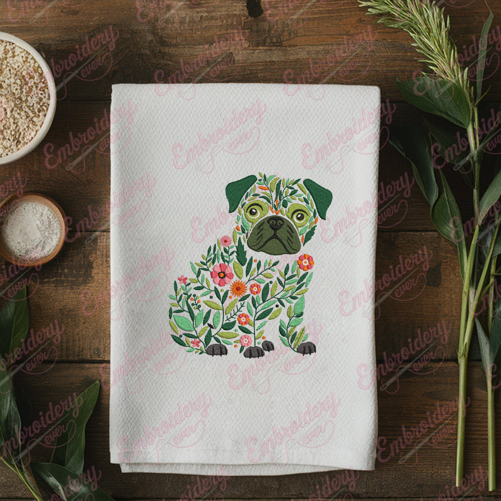 The Colorful Botanical Pug Dog Embroidery Design merges the charm of a beloved pug with vibrant botanical elements to create a striking visual statement. This expertly crafted design features intricate floral patterns intertwined with the distinct features of a pug, including its expressive eyes, wrinkled snout, and compact frame. The use of bold, lively colors enhances the natural beauty of the botanical motifs, producing a fresh, modern aesthetic ideal for embellishing apparel, accessories, or home décor. Perfect for embroidery enthusiasts seeking a unique project, this design offers detailed stitching guidance to achieve crisp outlines and rich textures that bring both the pug and the surrounding flora to life with precision and artistry.