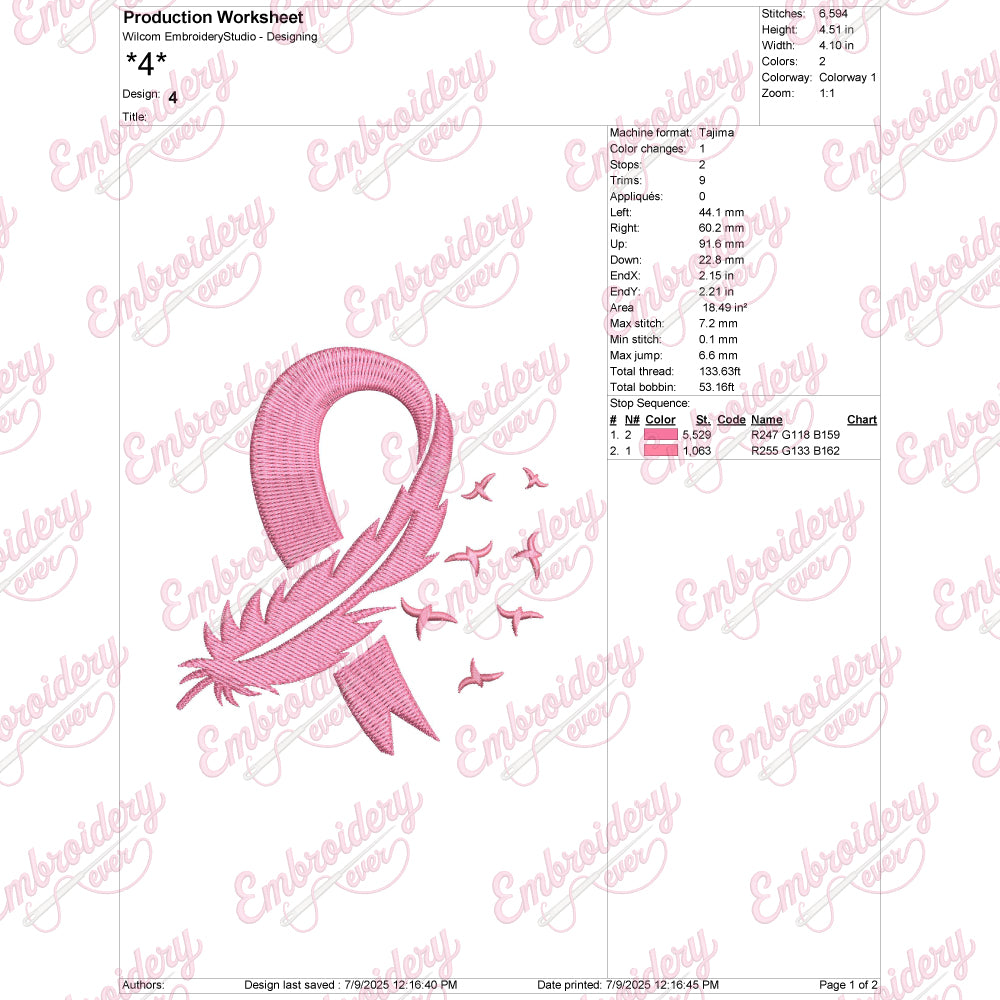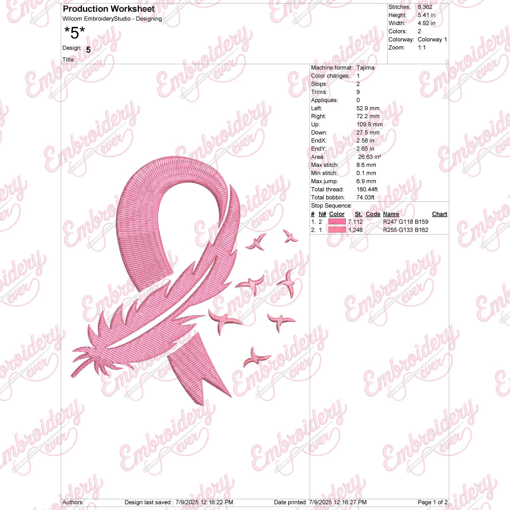 The Feather Pink Ribbon Breast Cancer Embroidery Design combines delicate artistry with a powerful symbol of awareness. Featuring a soft, feather-textured pink ribbon, this embroidery captures a subtle yet striking representation of breast cancer support. Designed with meticulous attention to detail, the feather effect adds depth and elegance, making it ideal for items like apparel, bags, or home textiles. This design not only enhances the visual appeal of your embroidery projects but also allows you to express solidarity with those affected by breast cancer. Its refined craftsmanship ensures clear stitching and durability, making it a practical and meaningful addition for advocacy or fundraising purposes.