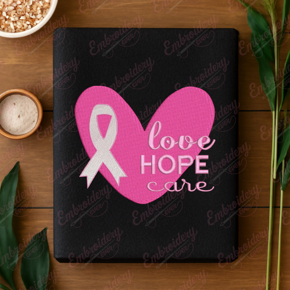 The Love Hope Care Breast Cancer Embroidery File is a meticulously crafted digital design perfect for creating meaningful, supportive embroidery projects. This file features elegant typography combined with symbolic breast cancer awareness elements, making it ideal for crafting heartfelt gifts, apparel, or accessories that promote awareness and hope. Expertly digitized for precision stitching, it ensures smooth, high-quality embroidery on various fabric types. Suitable for both beginners and experienced embroiderers, this file enables you to contribute to breast cancer awareness in a creative and impactful way. Elevate your crafts with a design that embodies compassion and encouragement.