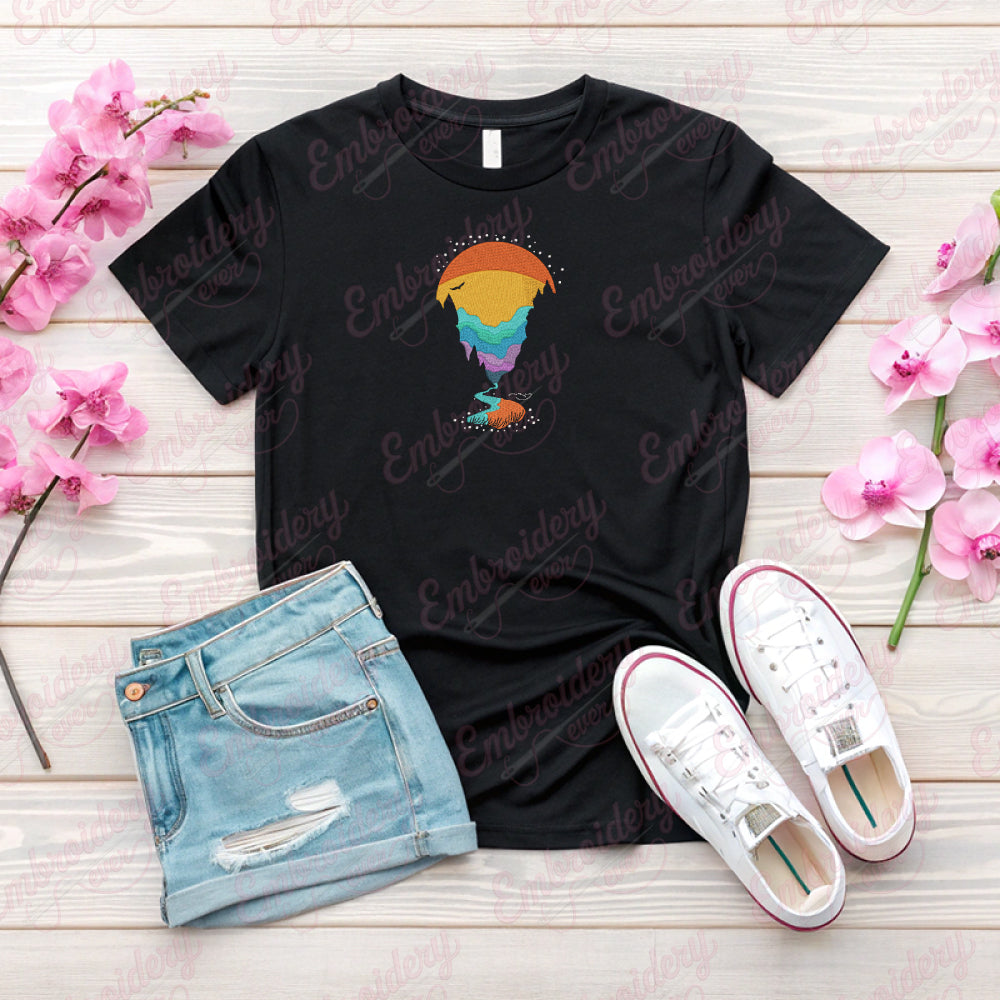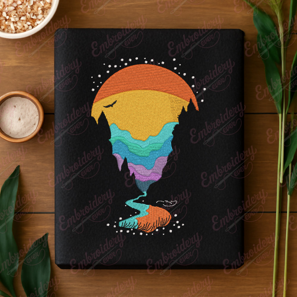 The Outdoor Sunset Vintage Embroidery Design captures the serene beauty of a natural sunset with a timeless vintage aesthetic. This detailed embroidery design features layered silhouettes of trees and mountains set against a glowing sun dipping below the horizon, evoking a calm, nostalgic outdoor scene. Expertly crafted to highlight intricate shading and texture, the design is ideal for adding character and depth to garments, accessories, or home decor. Its balanced composition and muted color palette suit a variety of fabric types and make it perfect for nature lovers seeking a sophisticated, classic embroidery motif that reflects the peaceful transition from day to night.