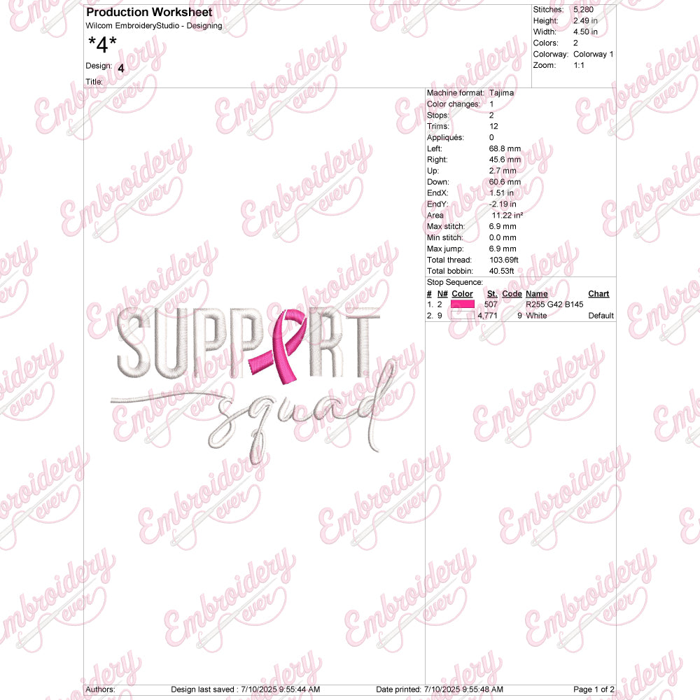 The Support Squad Breast Cancer Awareness Embroidery Design is a thoughtful and inspiring way to show solidarity with those affected by breast cancer. This meticulously crafted embroidery pattern features symbolic elements such as the signature pink ribbon, representing hope, strength, and unity in the fight against breast cancer. Perfect for embellishing clothing, accessories, or household textiles, this design not only enhances your items visually but also raises awareness through artistry. It is compatible with a wide range of embroidery machines, ensuring precise stitching and durability. Ideal for fundraisers, support groups, or personal projects, this design helps convey a powerful message of community support and resilience.
